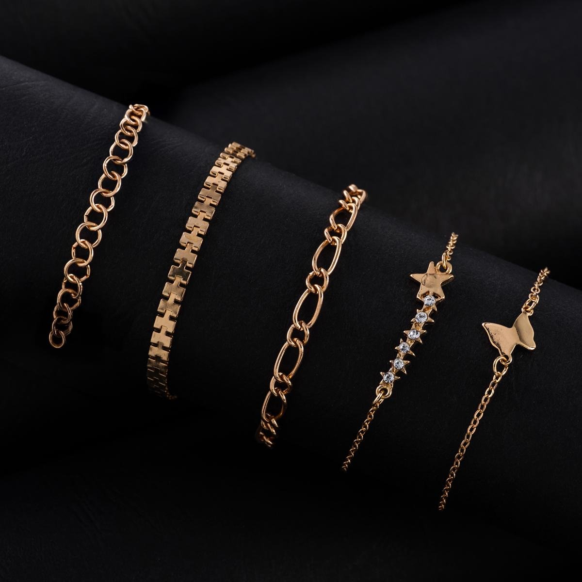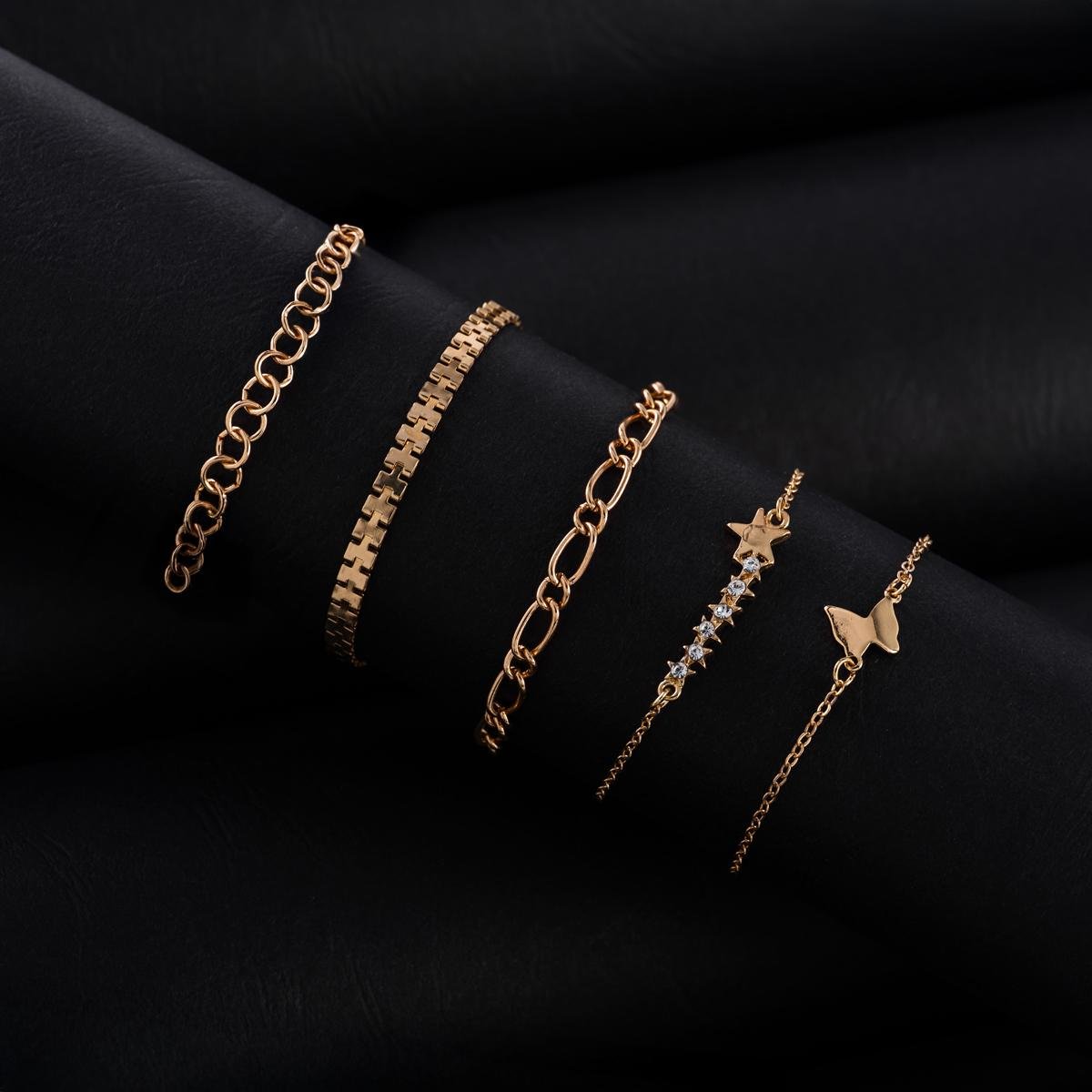 Radiate charm and sophistication with the Artificial Golden Glow Butterfly & Star Bracelet Set. This stunning 5-piece set combines delicate butterfly and star motifs with sleek chain designs, all beautifully gold-plated for a luxurious finish. Designed to complement both casual and formal looks, these bracelets effortlessly elevate your style while adding a touch of elegance and whimsy.