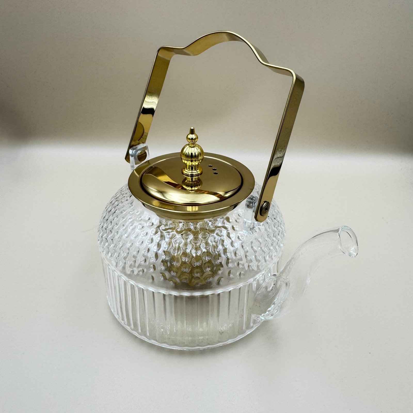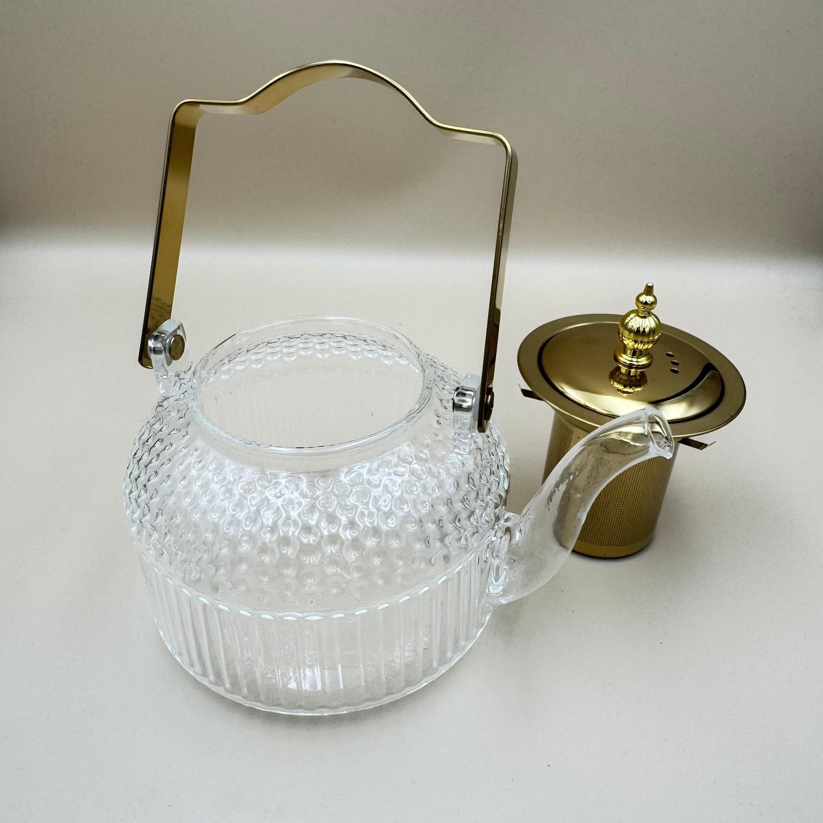 Fine tea deserves an equally luxurious teapot, such with a bubble cut glass teapot with an elegant gold lid, built-in tea infuser and curved handle