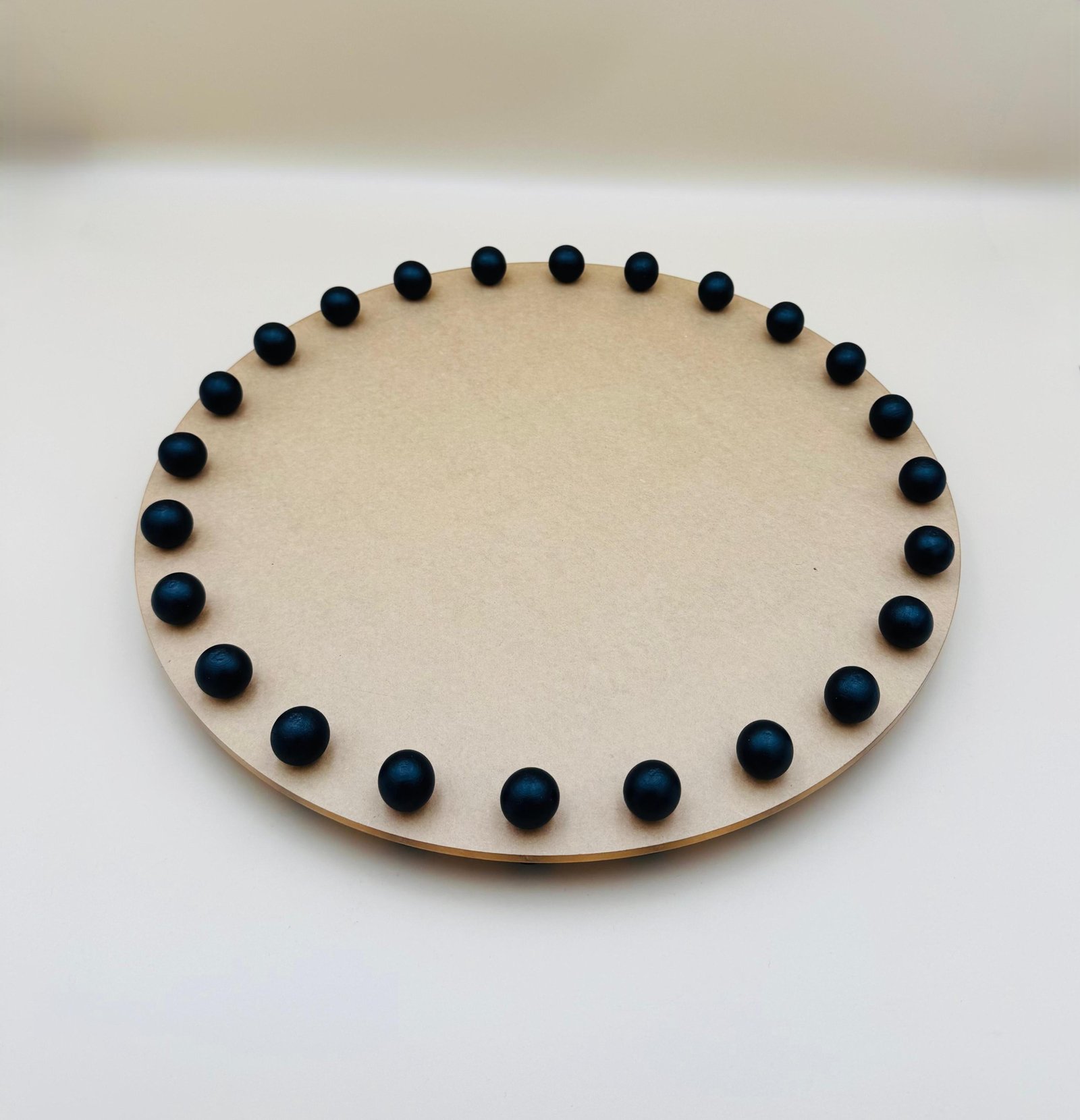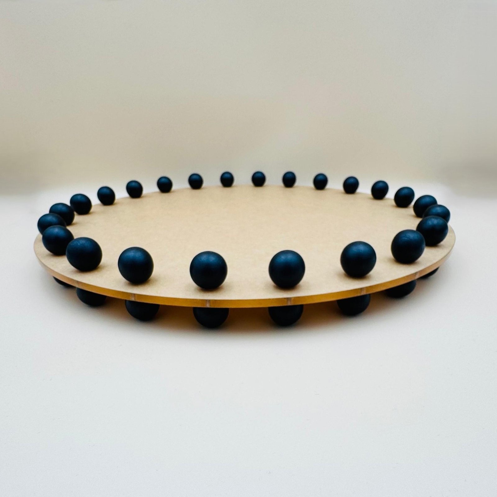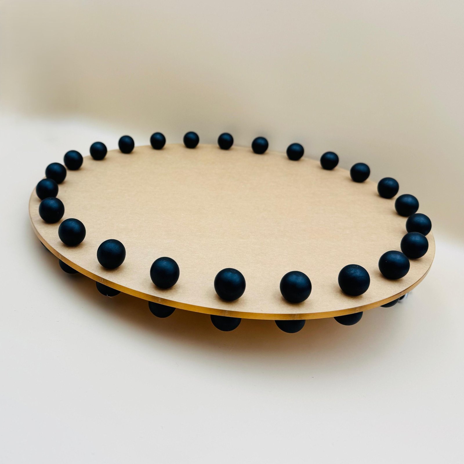 A round acrylic tray with a wooden edge decorated with black beads. This tray combines durability and beauty in a wonderful way. Made of durable acrylic and decorated with a distinctive black beaded wooden edge, this piece is perfect for presenting or organizing in style. The versatile design matches various home decor styles, adding a modern and elegant touch to your home