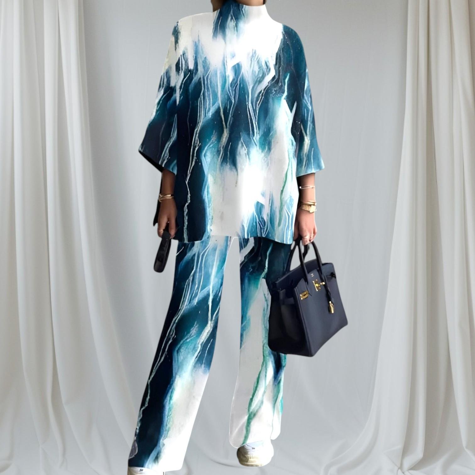 أضيفي لمسة فنية إلى إطلالتك مع هذا الست المكون من قطعتين تصميم الطبعة التجريدية يمنحكِ إطلالة مميزة، بينما البلوزة الواسعة والسروال الفضفاض يضمنان راحة أنيقة. مثالي للخروج مع الأصدقاء، المناسبات العادية، أو حتى كإطلالة مريحة للعمل.