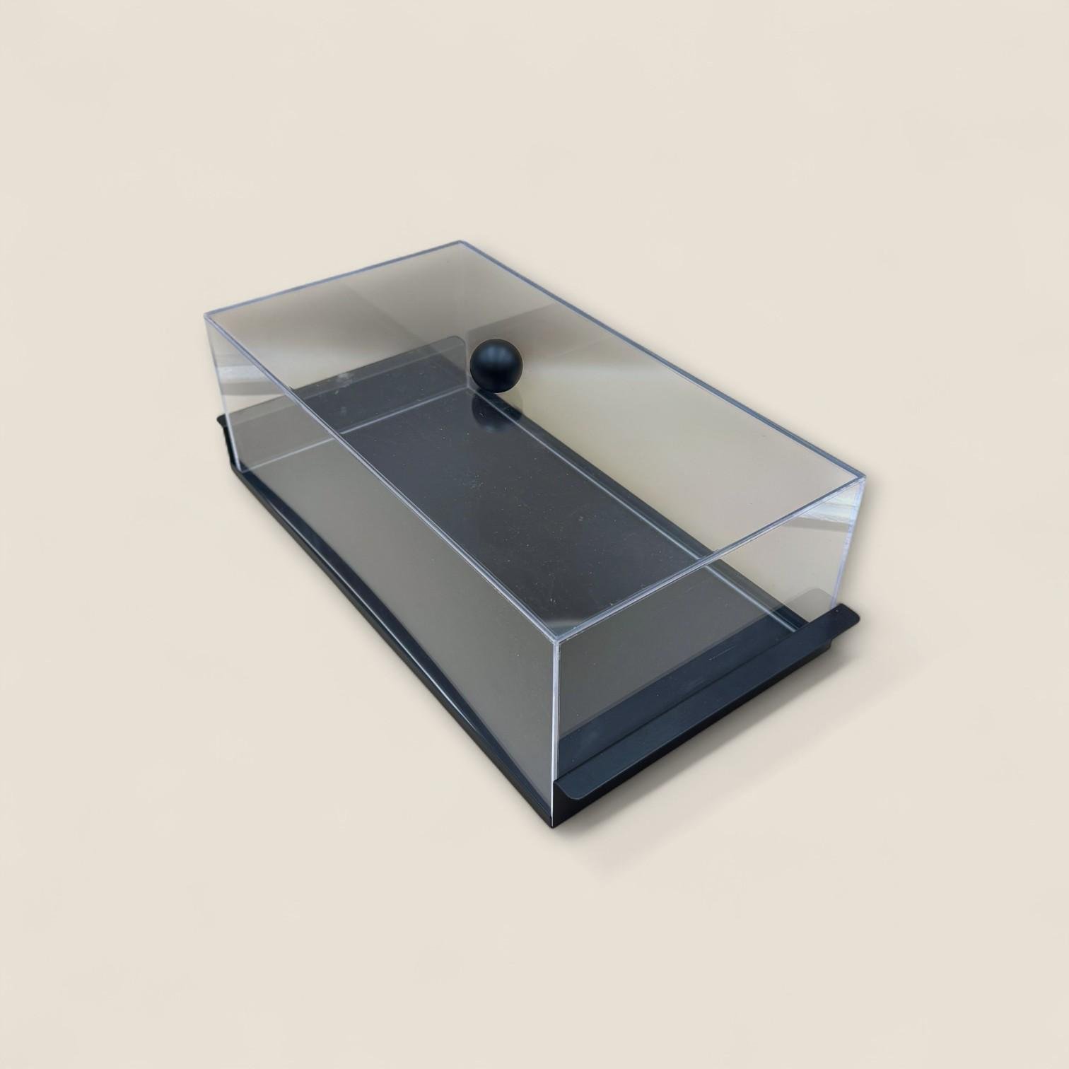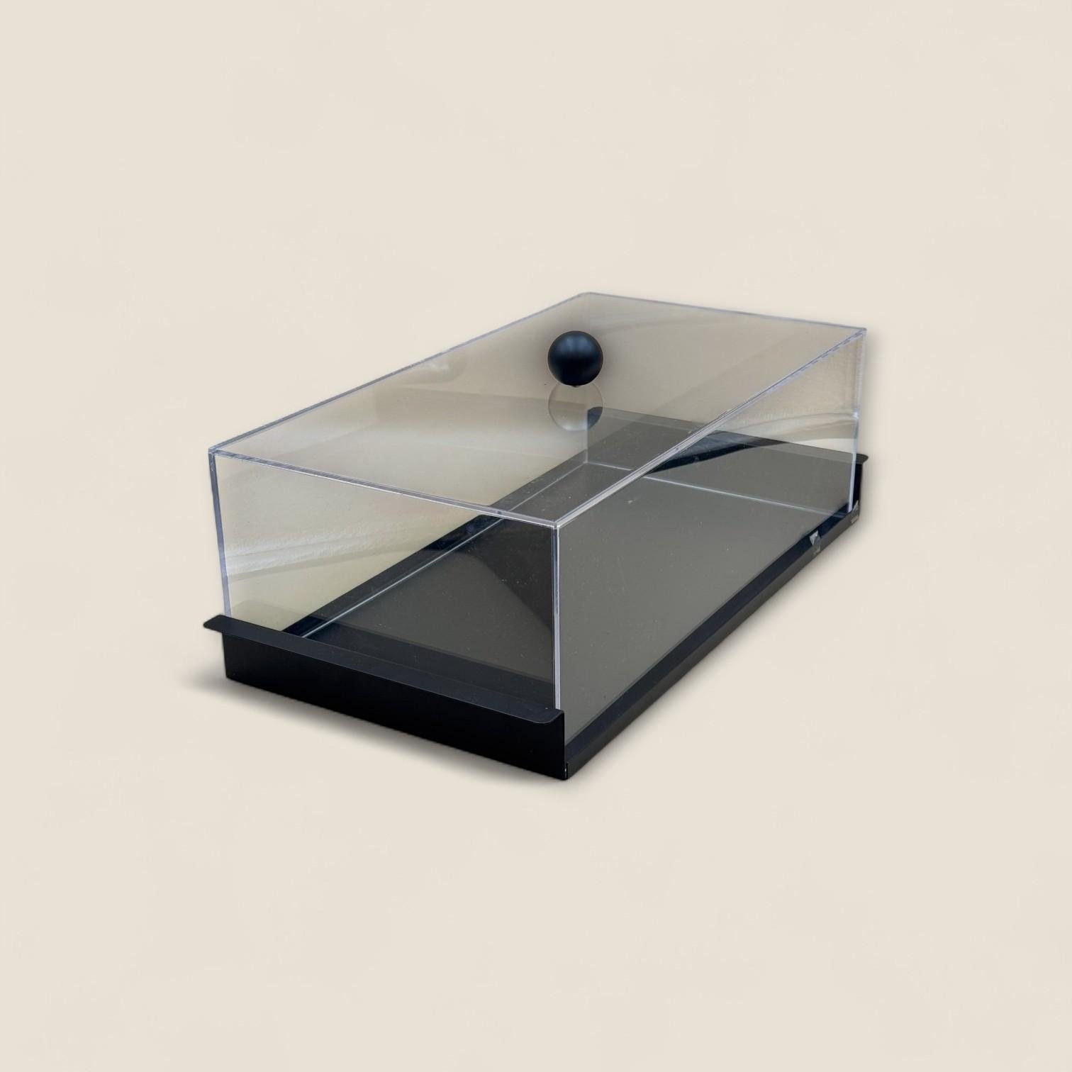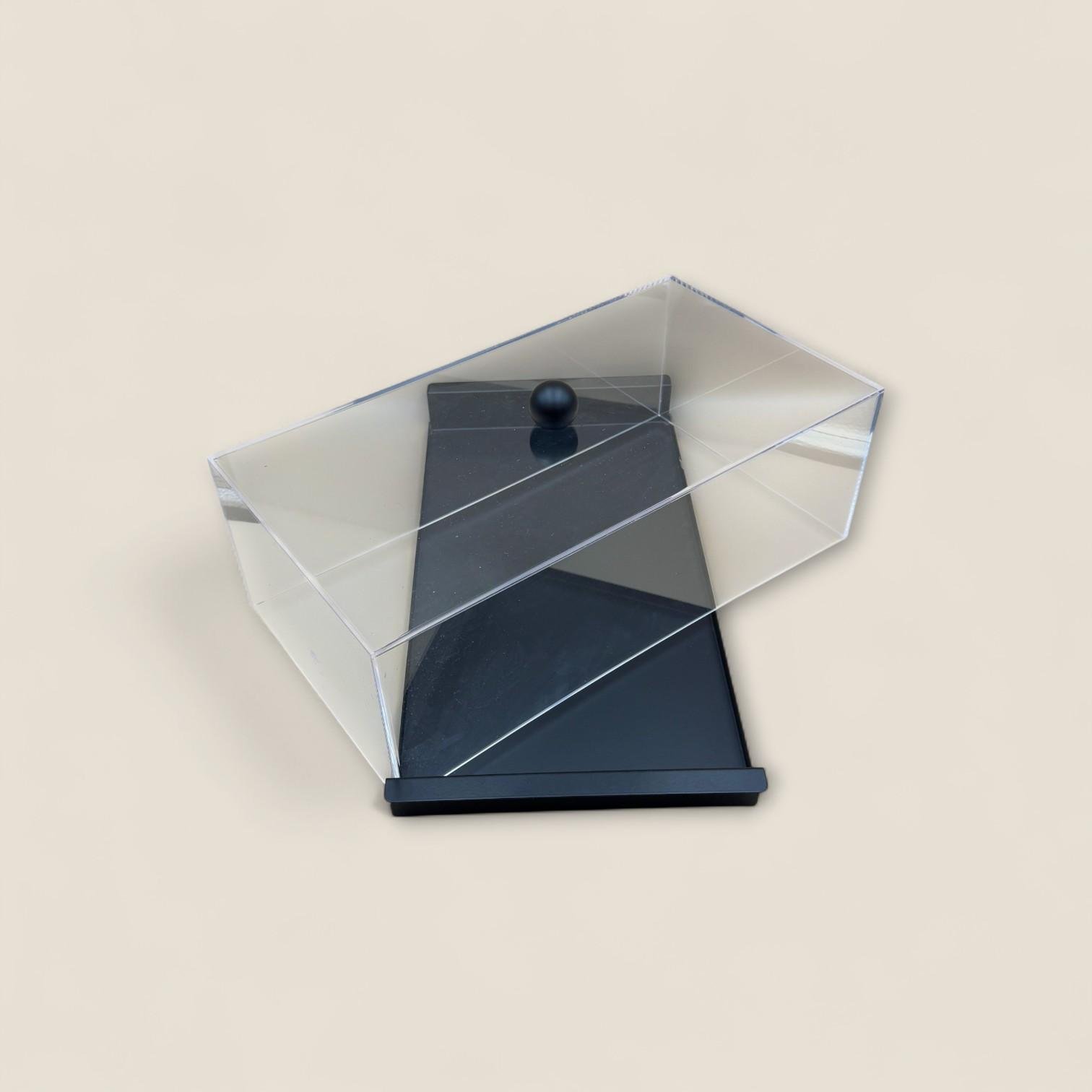 علبة الكيك المستطيلة من الأكريليك تستخدم لحفظ الحلويات وحمايتها مع إبراز جمالها في نفس الوقت. الغطاء الشفاف يُظهر تفاصيل الكيك دون الحاجة لفتحه، بينما تضمن القاعدة السوداء المتينة ثبات الكيك وتضفي لمسة راقية على التقديم.