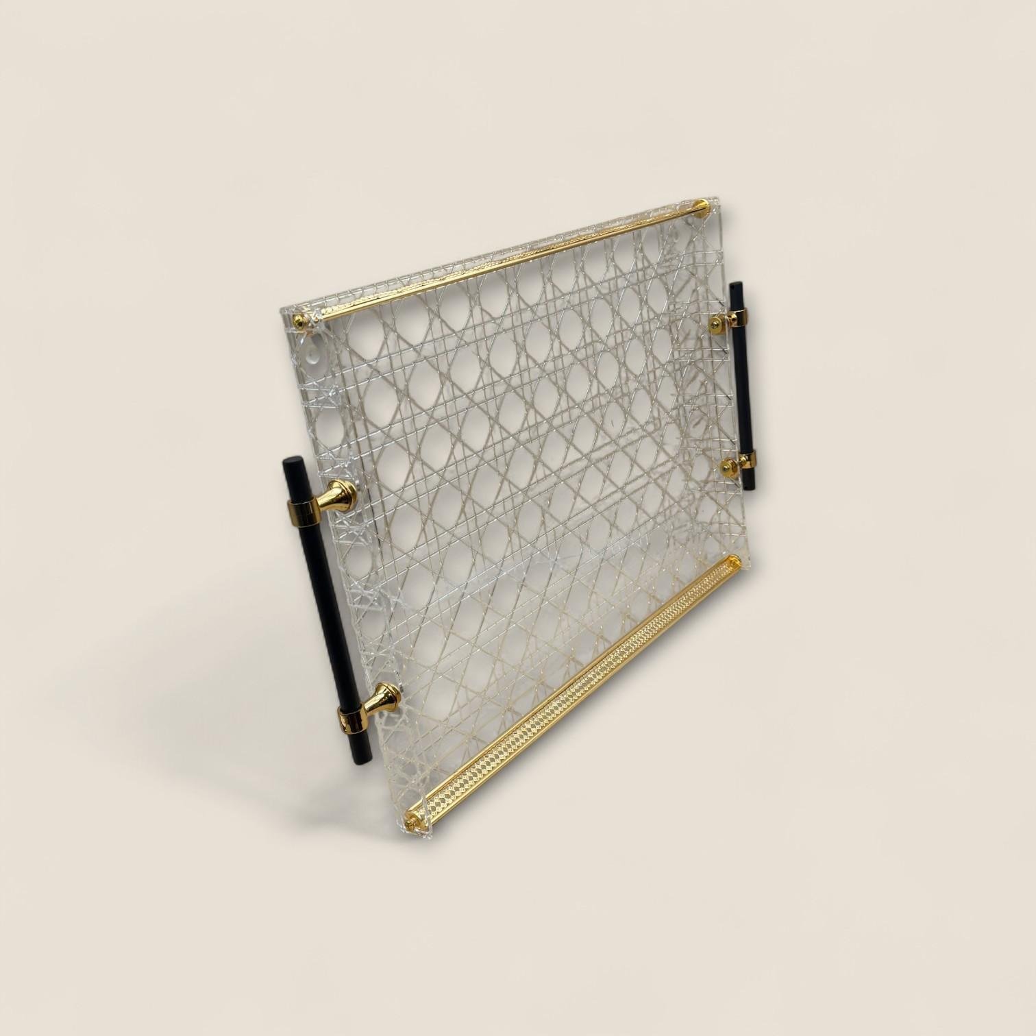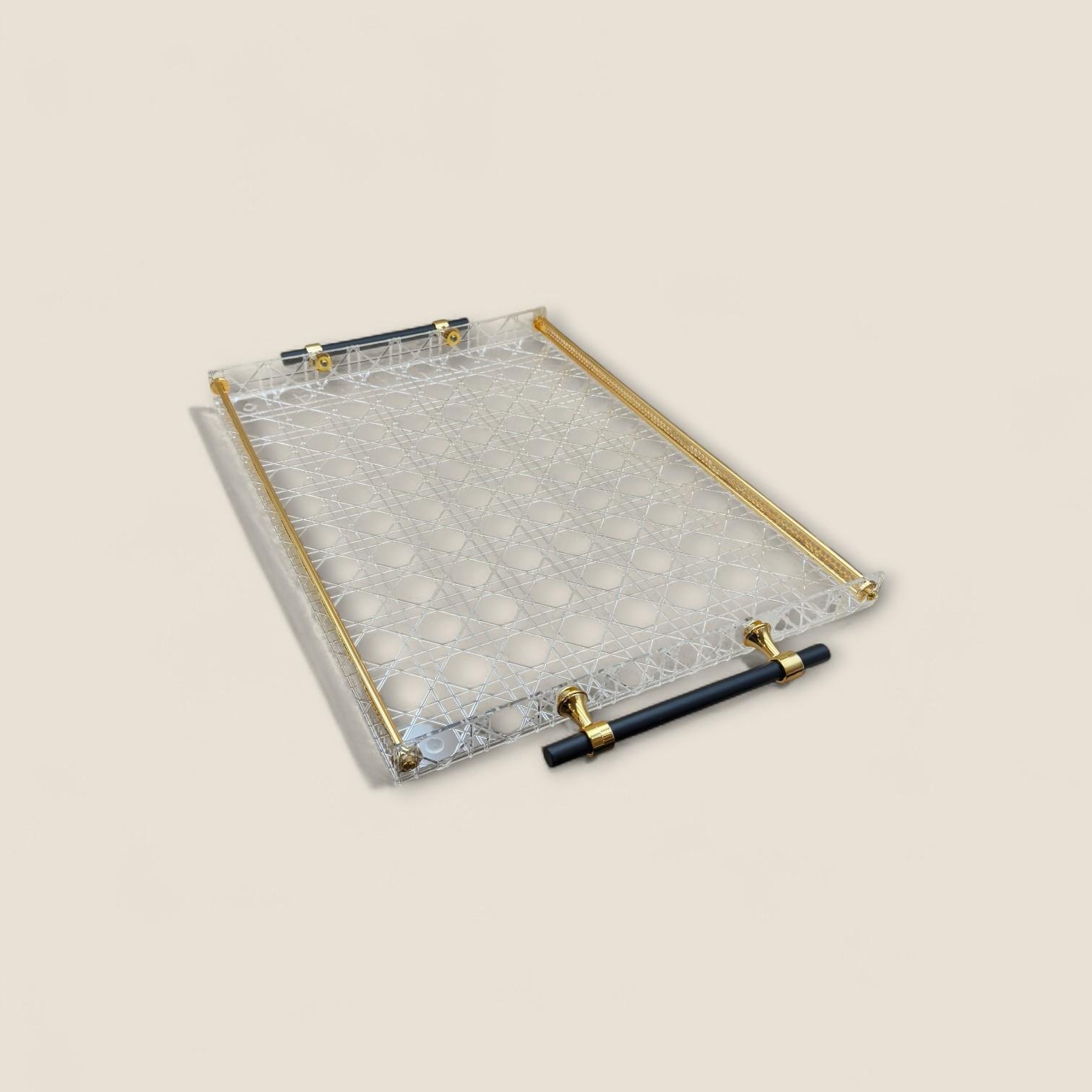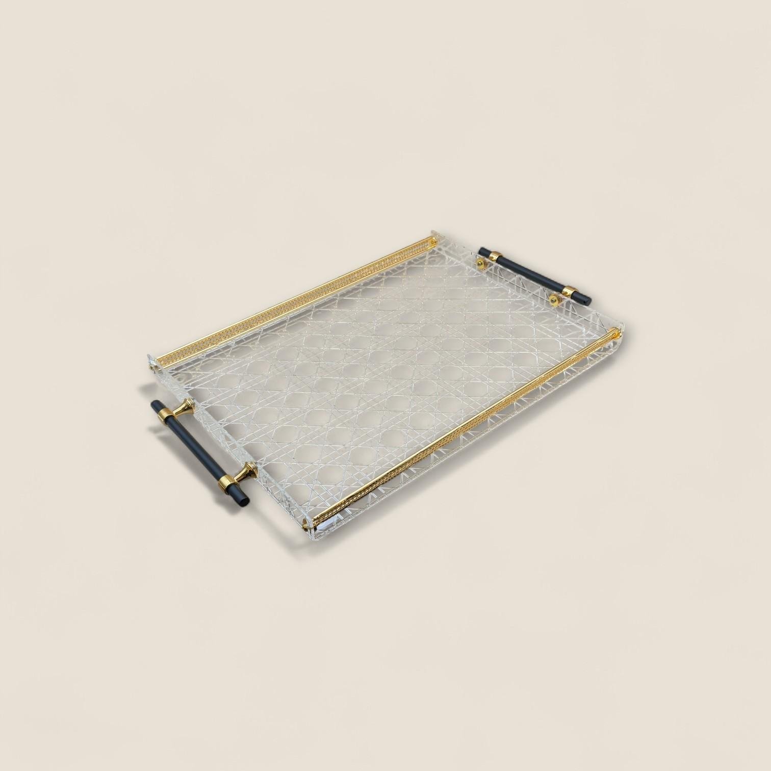 صينية مصنوعة من الأكريليك عالي الجودة لضمان المتانة والوضوح، مع مقابض معدنية أنيقة بلون ذهبي وأسود تضيف لمسة فخمة وملفتة لأي طاولة أو سطح تقديم.