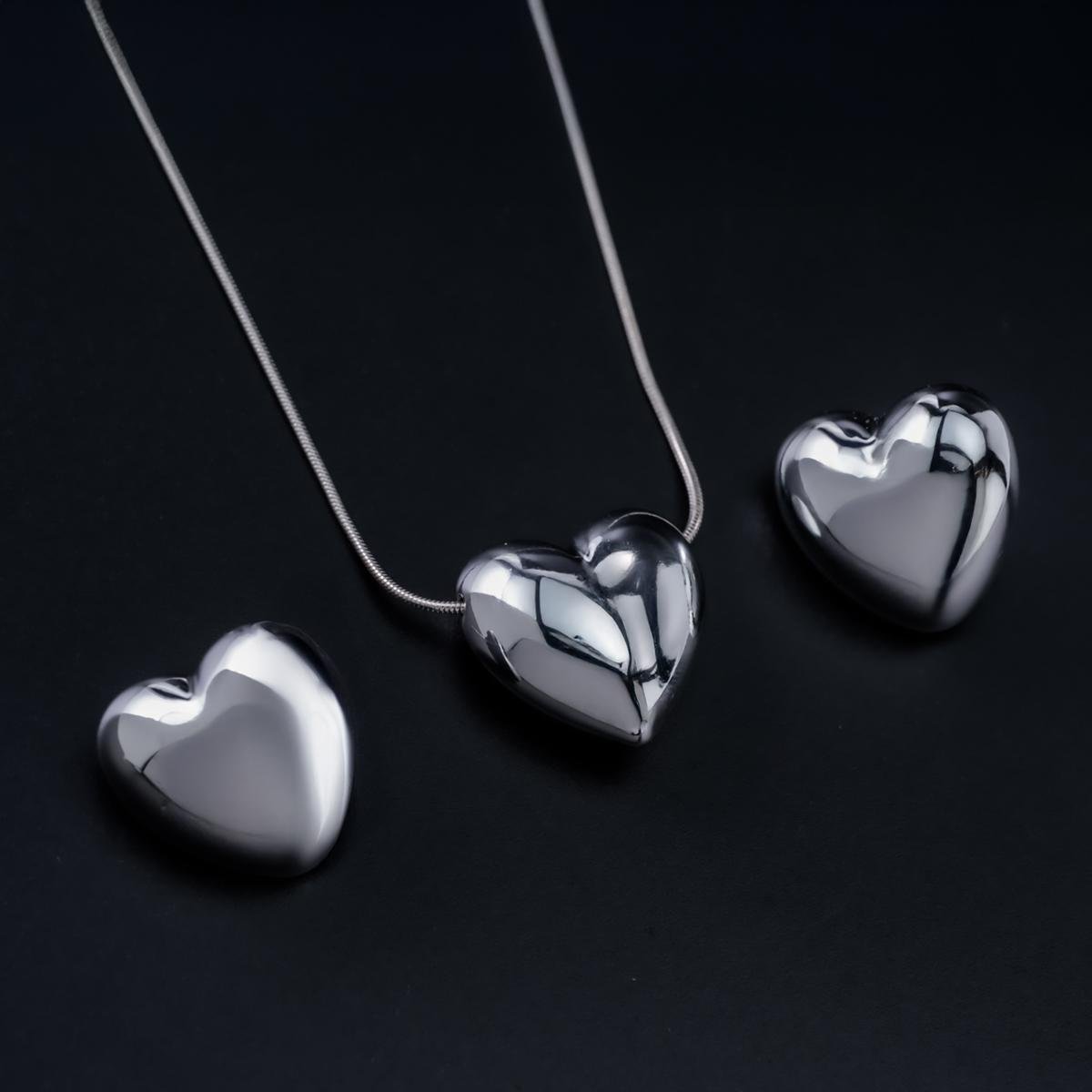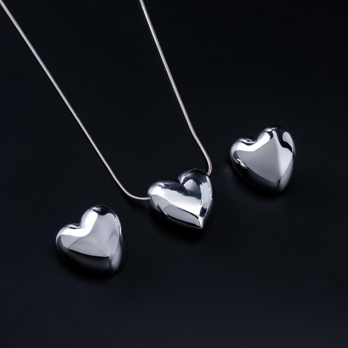 أضيفي لمسة من الأناقة والرومانسية إلى إطلالتك مع طقم العقد بتعليقة قلب منفوخ براقة وأقراط الستد المعدنية اللامعة. يتميز العقد بتصميم قلب منفوخ راقٍ ولمعان معدني مرآتي يعكس الضوء بشكل رائع ليمنحك إطلالة أنيقة ومتألقة. وتكمل أقراط الستد المتناسقة الطقم بأسلوب بسيط وجذاب، مما يجعله مثاليًا لـ المناسبات الخاصة أو الإطلالات اليومية أو كهدية مميزة لشخص عزيز.