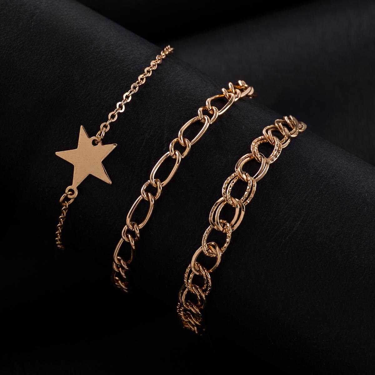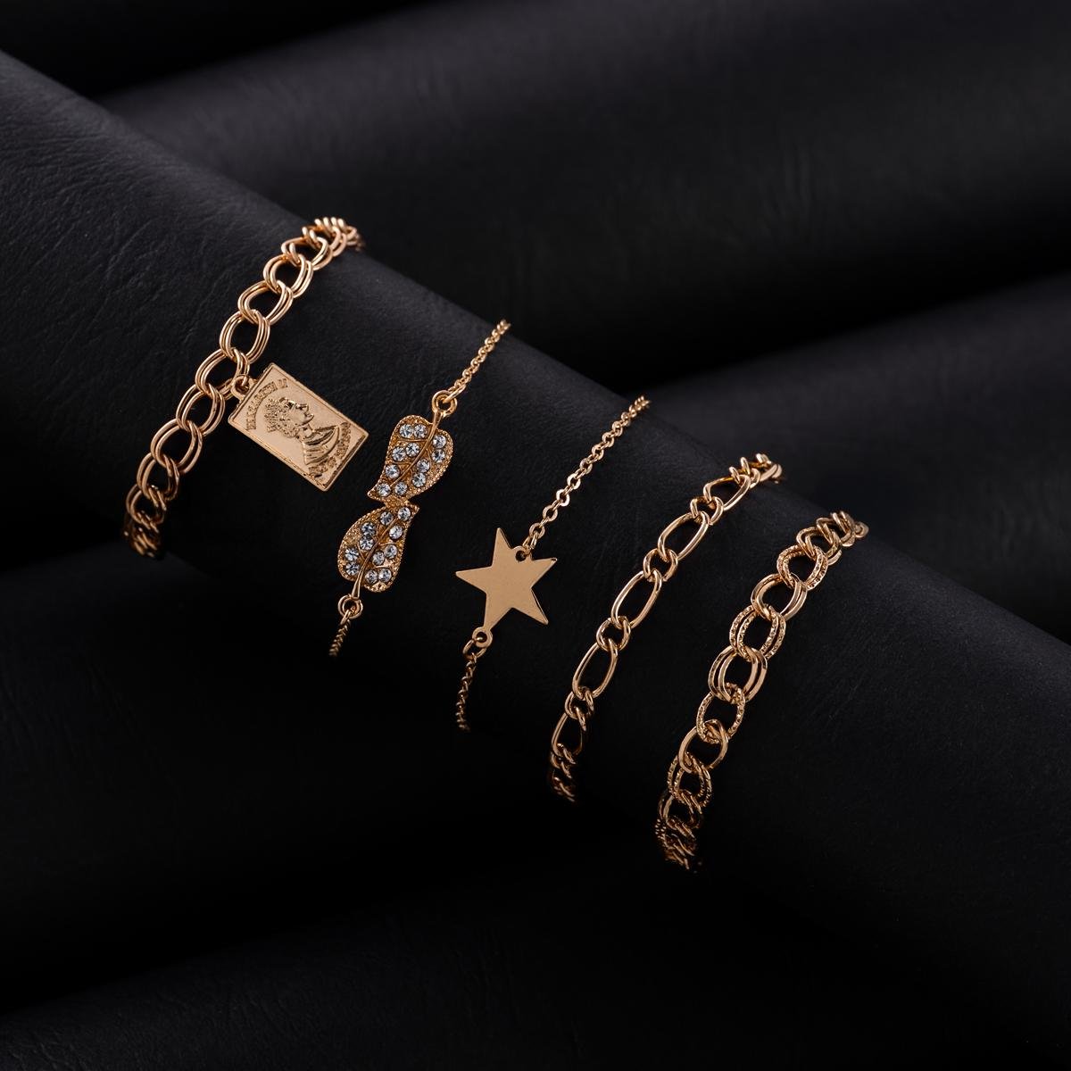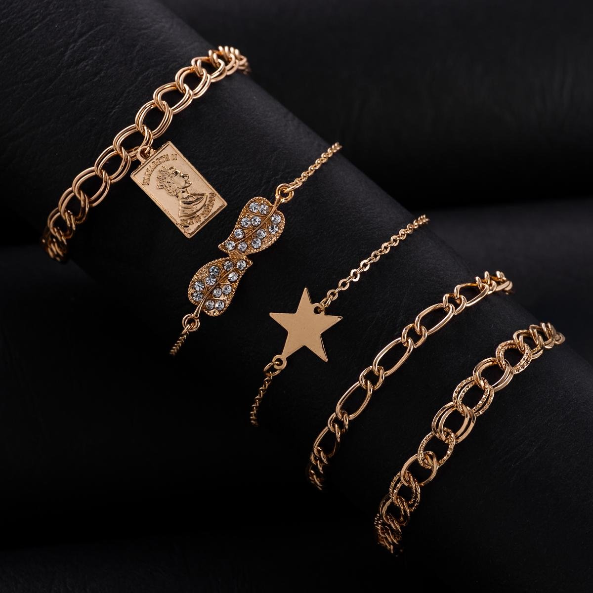 أضيفي بريقًا سماويًا إلى إطلالتك مع مجموعة أساور الأناقة النجمية الاصطناعية. تتميز هذه المجموعة الرائعة المكونة من خمسة أساور مطلية بالذهب بتصاميم نجمية مبهرة وسلاسل أنيقة ولمسات كريستالية رقيقة. مثالية للخروجات اليومية أو المناسبات الفاخرة، تضيف هذه المجموعة لمسة من الجاذبية والأناقة لأي زي.