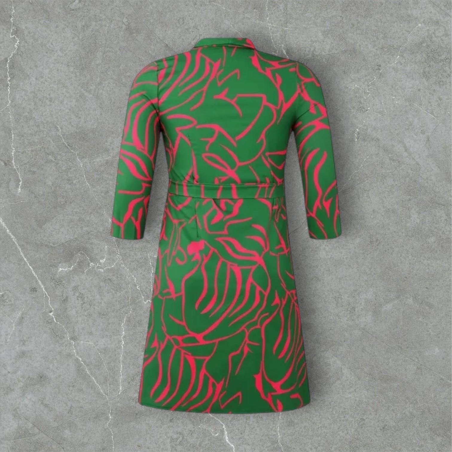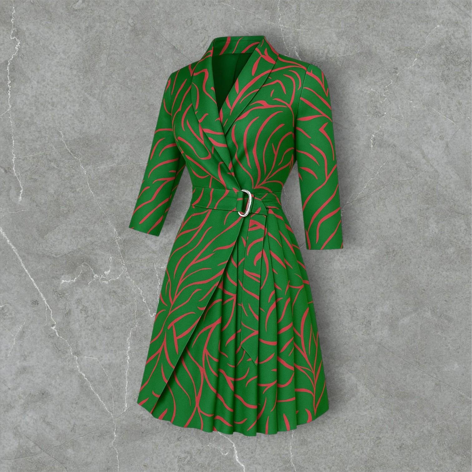 يتميز هذا الفستان بقَصّة لف جذابة تربط حول الخصر بحزام أنيق يبرز جمال القوام ويمنحك إحساساً بالثقة. تضيف طبعة الأوراق التجريدية لمسة فنية وعصرية، بينما تمنح الكسرات السفلى للفستان حركة وانسيابية جذابة. وتكمل الياقة النوتش المظهر بطابع كلاسيكي مصقول، مما يجعله مناسباً للعمل، أو الخروجات الأنيقة، أو المناسبات شبه الرسمية.
