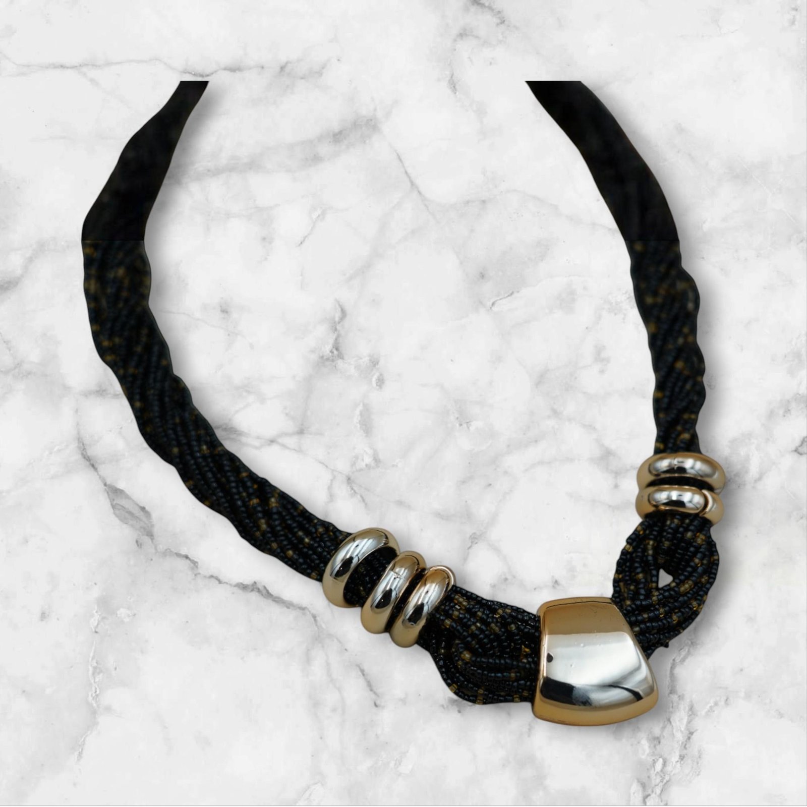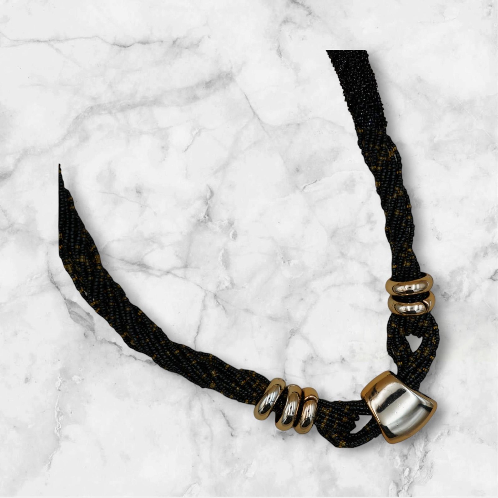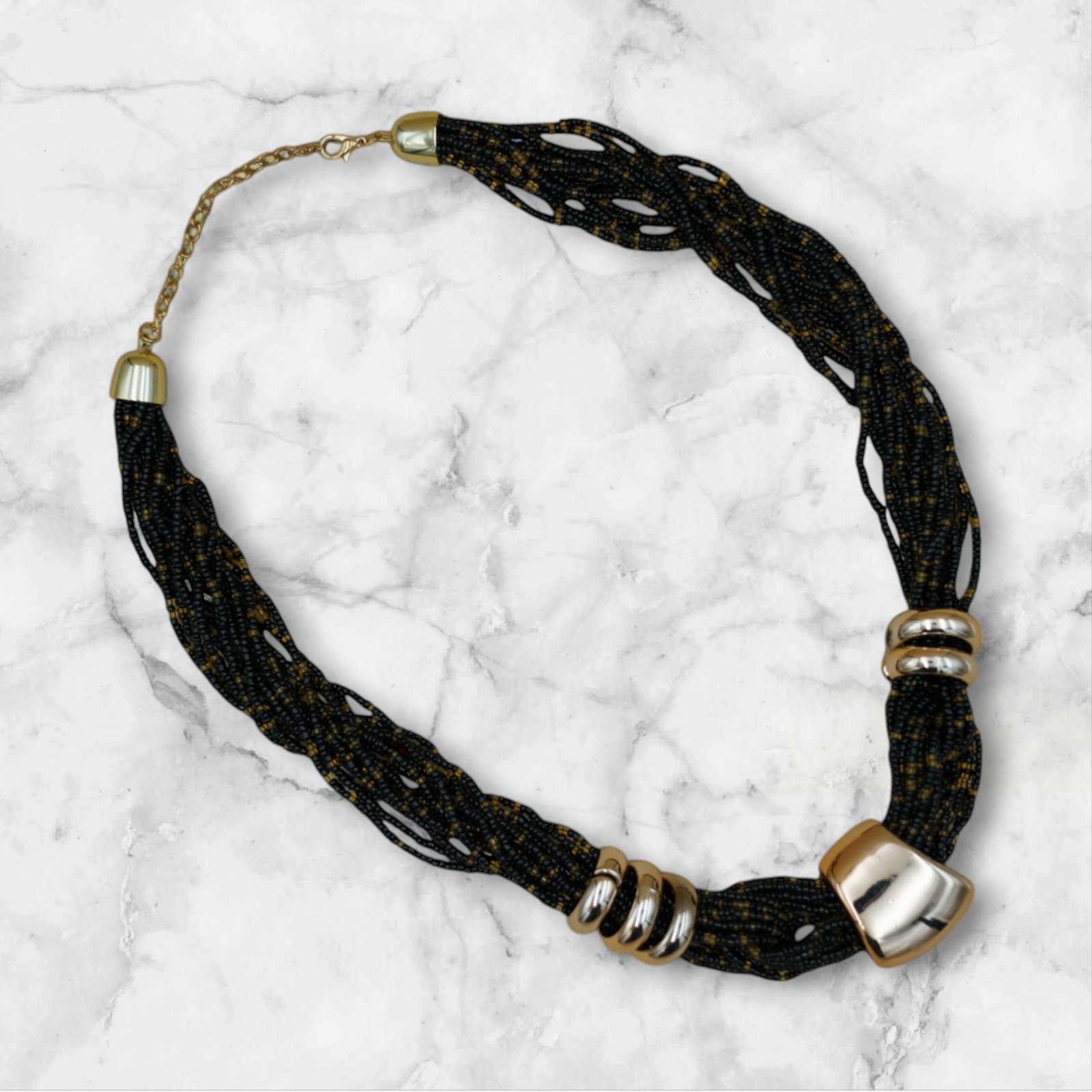 عقد الخرز الأسود المنسوج مع اللمسات الذهبية اللامعة يضيف لمسة فاخرة ومميزة لإطلالتك. خيوط متقنة من الخرز الأسود تتشابك بتصميم أنيق يشبه الطوق.