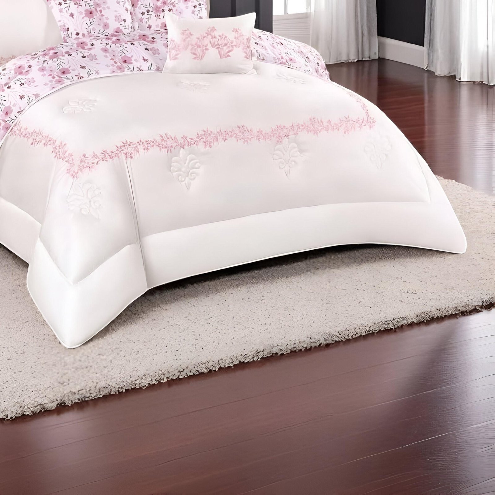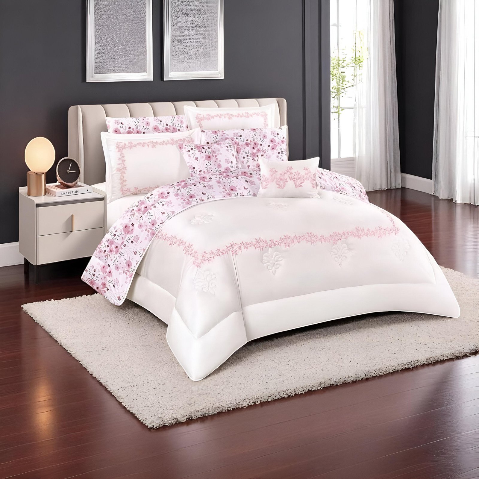 طقم مفارش مكون من 8 قطع. يتميز بقماش ساتان فاخر مطرز وتصميم زهور قابل للعكس يمنحك خيارين أنيقين في طقم واحد. البطانية ناعمة ودافئة، والتطريز يضفي لمسة فنية راقية تضيف طابعاً أنثوياً ساحراً إلى أي غرفة نوم.