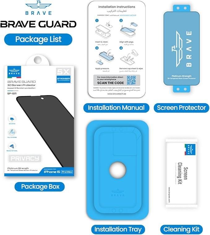 احمِ جهاز iPhone 15 Pro Max الخاص بك مع حامي الشاشة Brave Guard ثلاثي الأبعاد. يوفر هذا الحامي الفاخر حماية لا مثيل لها من الصدمات والخدوش مع الحفاظ على خصوصيتك. مصمم بتقنية متقدمة، يضمن بقاء شاشتك واضحة وآمنة.