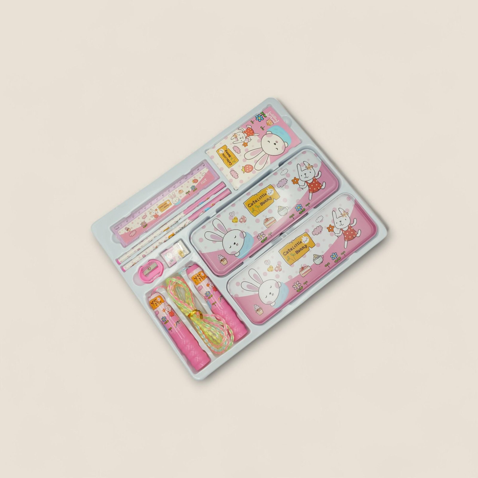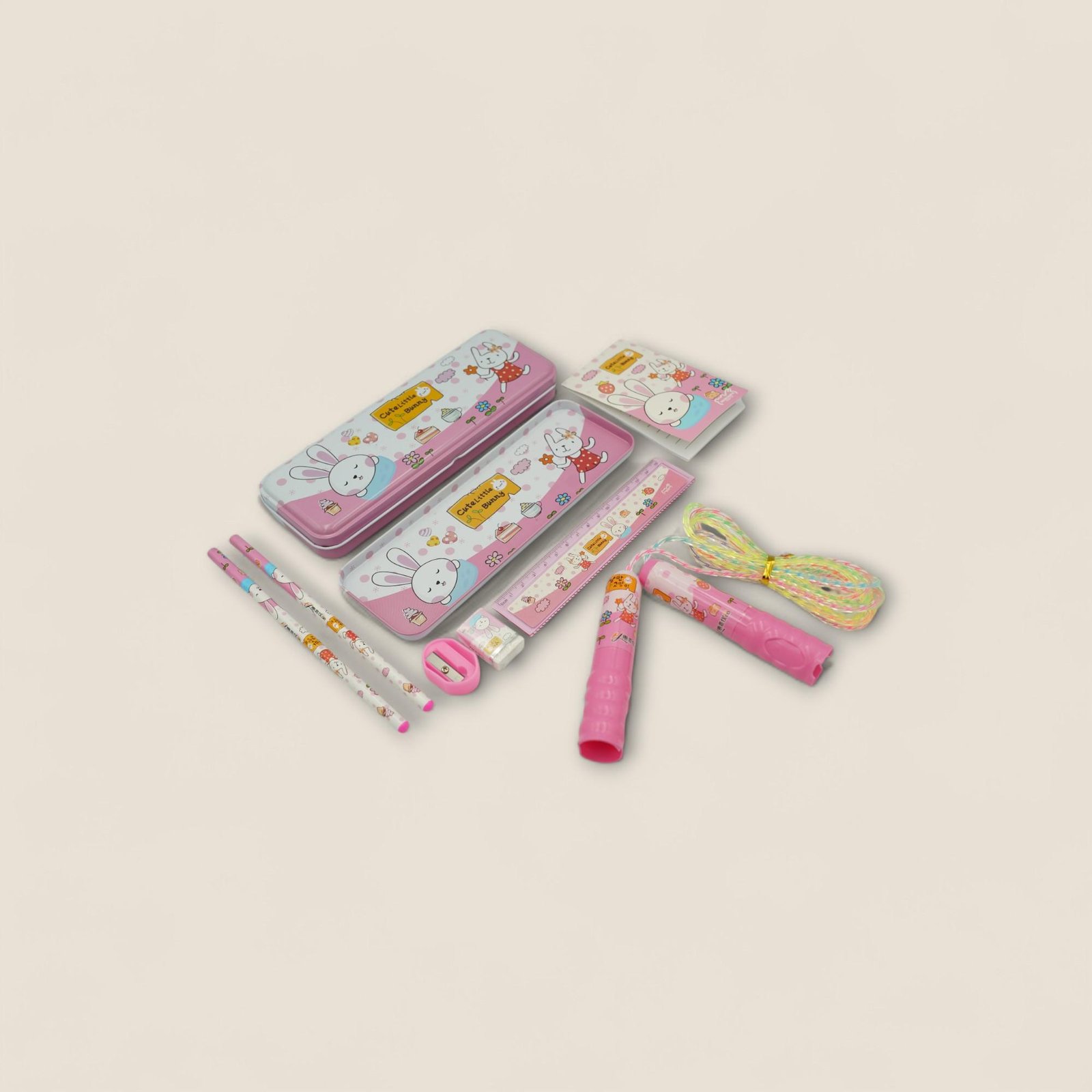 مجموعة مميزة تضم الأدوات المدرسية الأساسية التي يحتاجها الأطفال، جميعها مزينة برسومات أرنب ظريفة تعشقها الصغار.