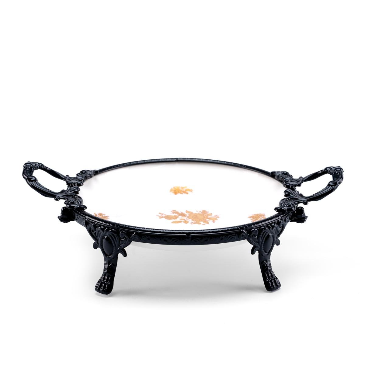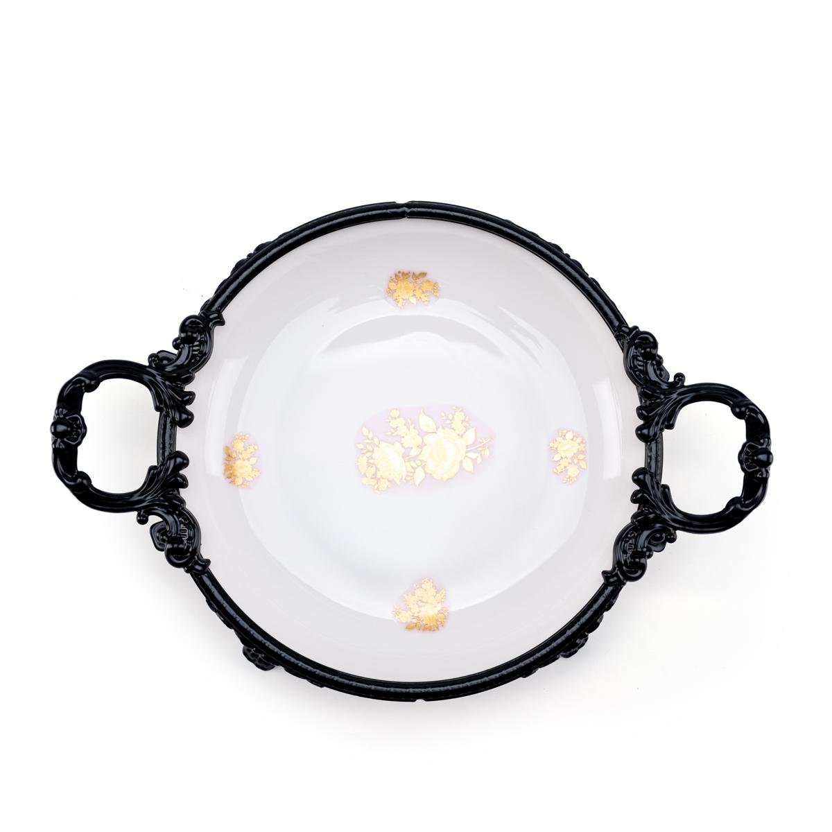 اخترنا لكِ طريقة تقديم للطعام مميزة وأنيقة مع هذا الوعاء الدائري الفاخر المصمم بإطار معدني أسود أنيق ونقوش زهور ذهبية على قاعدة زجاجية بيضاء ناعمة.