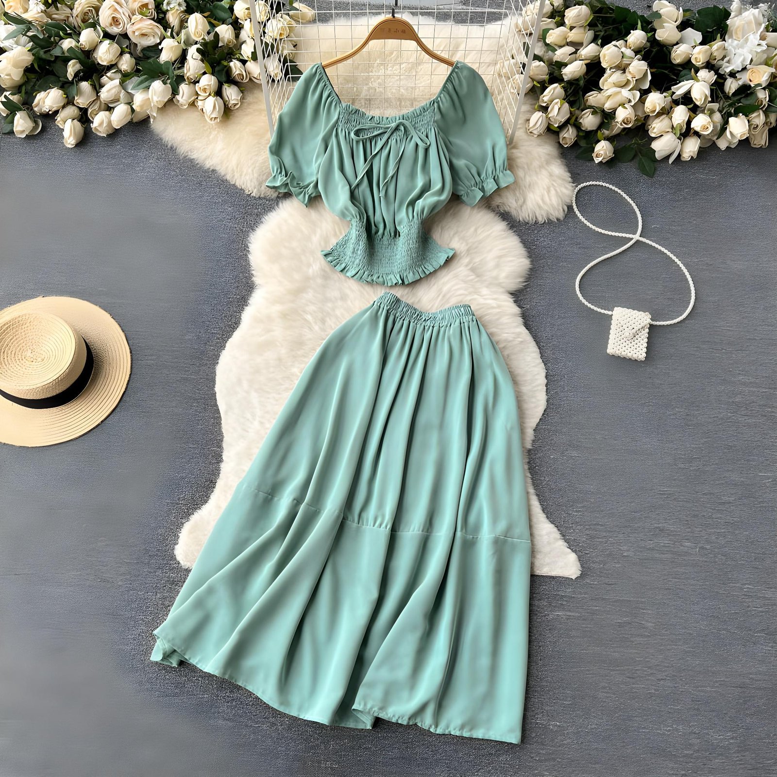 تتميز البلوزة بأكمام منفوخة تضيف لمسة رومانسية، وتصميم لف يبرز جمال القوام، مع ظهر سموكد مرن يمنحك راحة مثالية. أما التنورة الماكسي، فهي واسعة ومريحة وتتحرك بانسيابية مع كل خطوة، مع خصر مطاطي أنيق. الطباعة الزهرية تضيف لمسة انتعاش، ما يجعل هذا الطقم مثالياً للأيام المشمسة، الرحلات، أو المناسبات الخارجية.