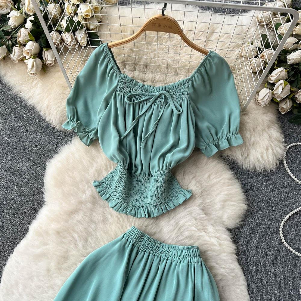 طقم بلوزة بأكمام منفوخة بتصميم لف يبرز جمال إطلالتك، مع ظهر سموكد مرن يمنحك راحة مثالية. أما التنورة الماكسي، فهي واسعة ومريحة وتتحرك بانسيابية مع كل خطوة، مع خصر مطاطي أنيق. الطباعة الزهرية تضيف لمسة انتعاش.