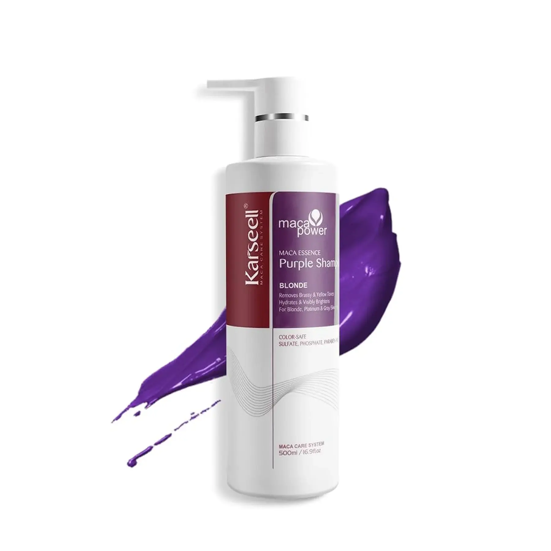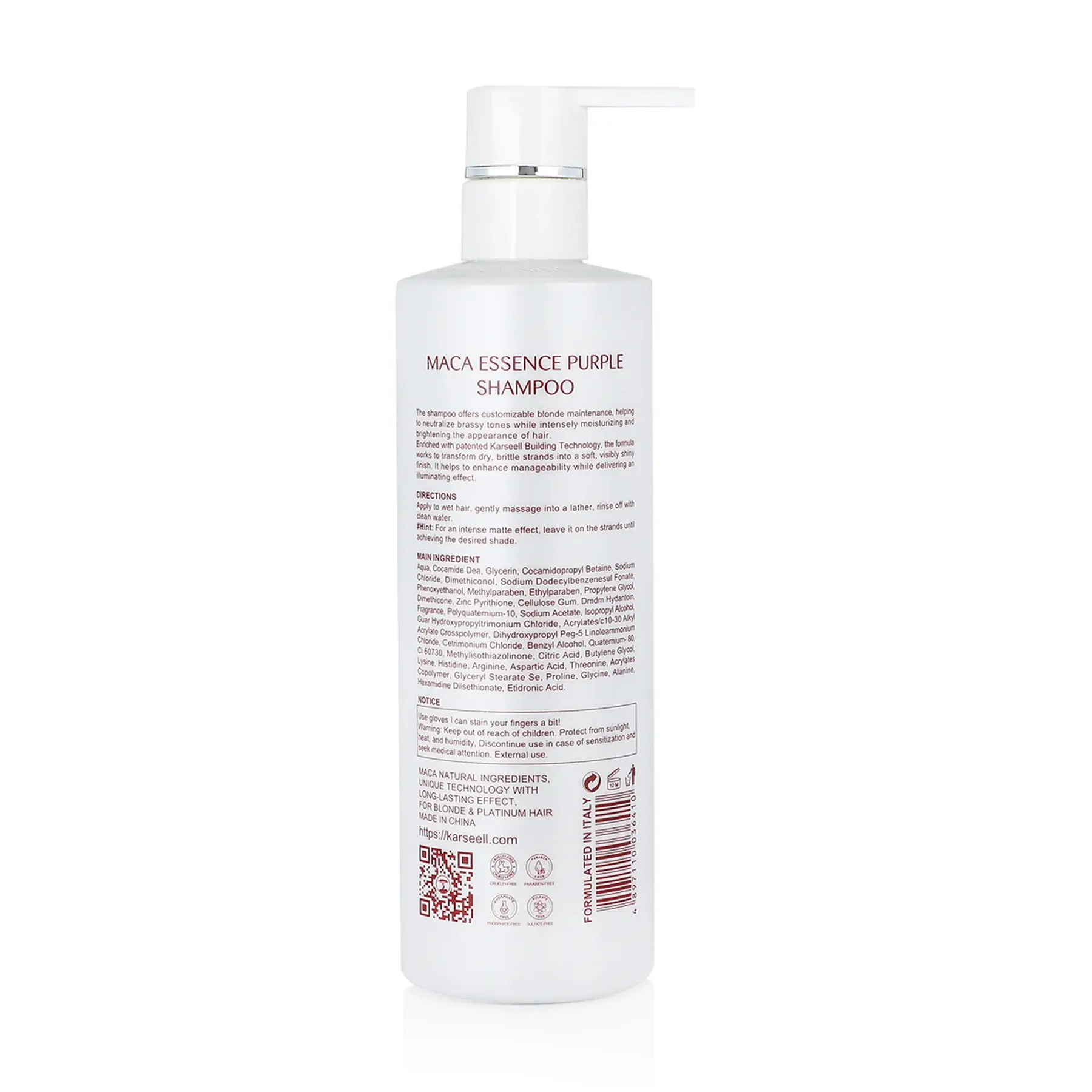 شامبو كارسيل ماكا باور إيسينس البنفسجي. يحتوي على صبغات بنفسجية، خلاصة جذور الماكا، وزيت الأرجان، مما يساعد على توحيد لون الشعر، ترطيبه، وتقويته، مع التخلص من الدرجات الصفراء غير المرغوب فيها وإضافة لمعان ونعومة.
