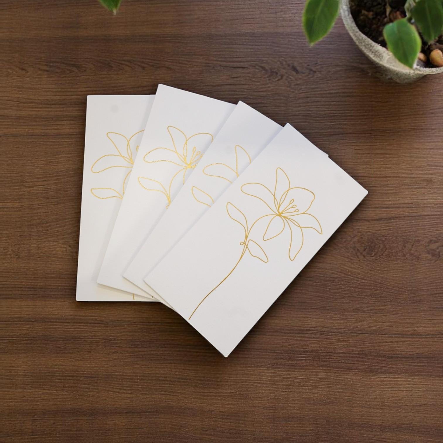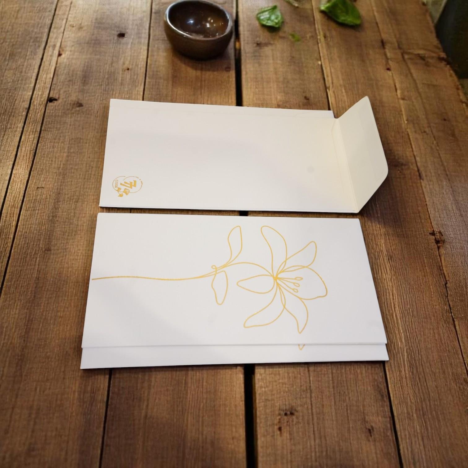 أظرف بيضاء أنيقة مصنوعة من ورق فاخر بتصميم زهور ذهبي راقٍ، تضيف هذه الأظرف لمسة جمالية تعكس الذوق الرفيع والاهتمام بالتفاصيل.
