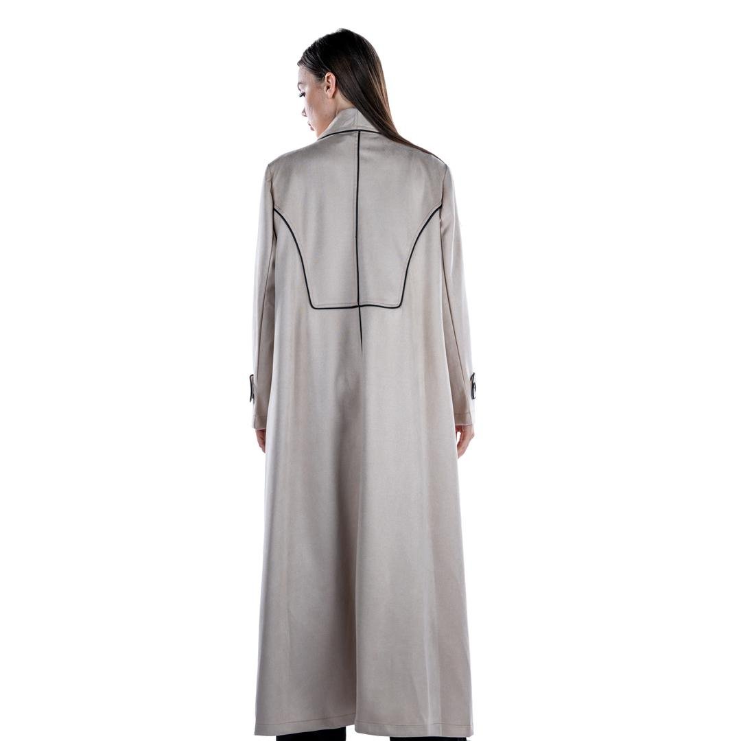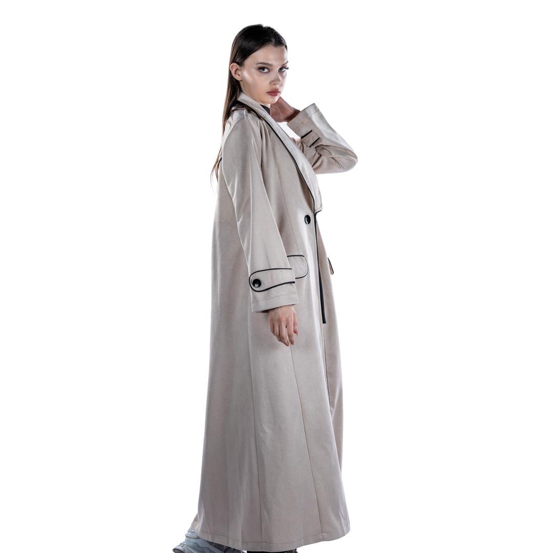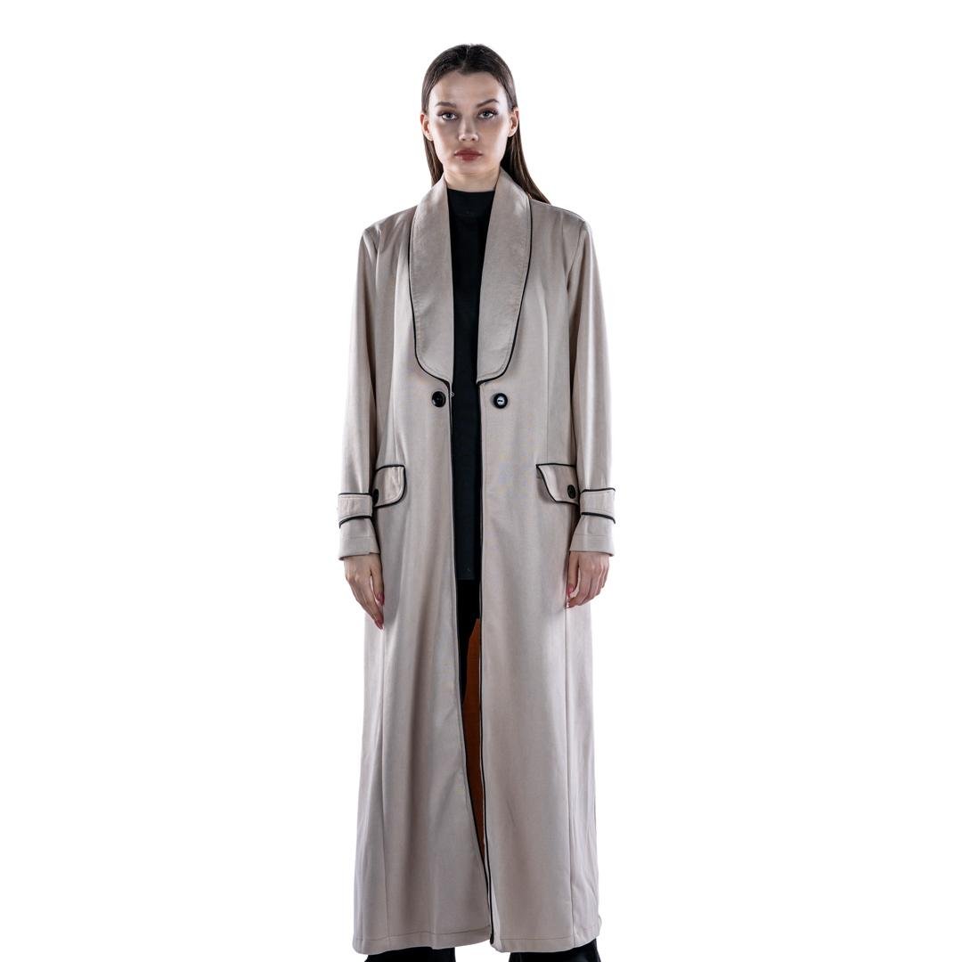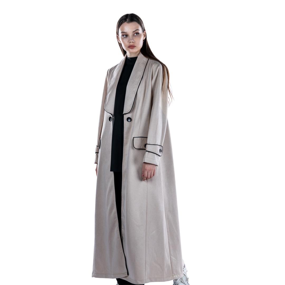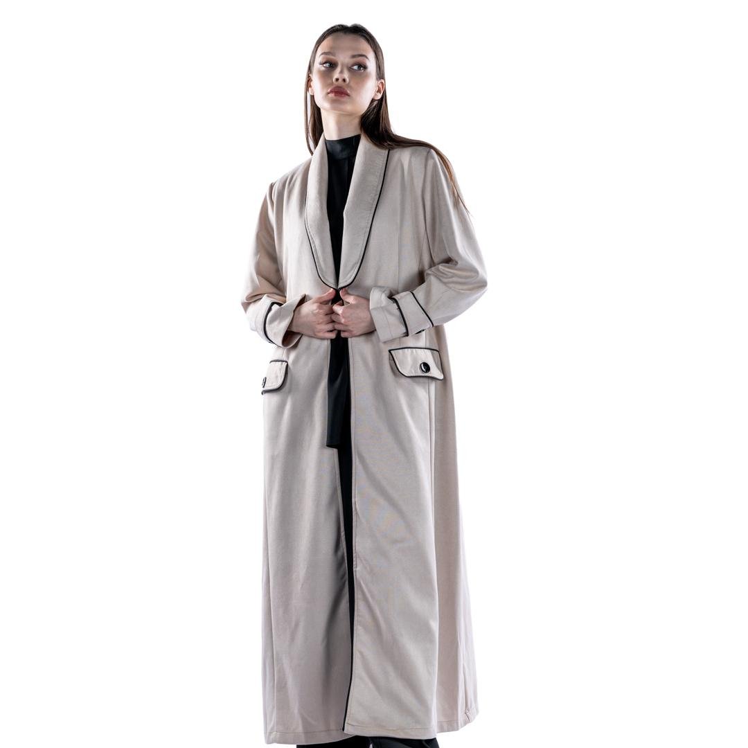 يتميز هذا المعطف بخطوط سوداء على الياقات والأكمام والجيوب، مما يجمع بين التصميم الكلاسيكي واللمسة العصرية. مصنوع من مواد عالية الجودة، يمنحكِ هذا المعطف شعور بالراحة والدفء، مما يجعله قطعة ضرورية لخزانة ملابسك لأي موسم. قطعة متعددة الاستخدامات يمكن ارتداؤها في المناسبات المختلفة.
