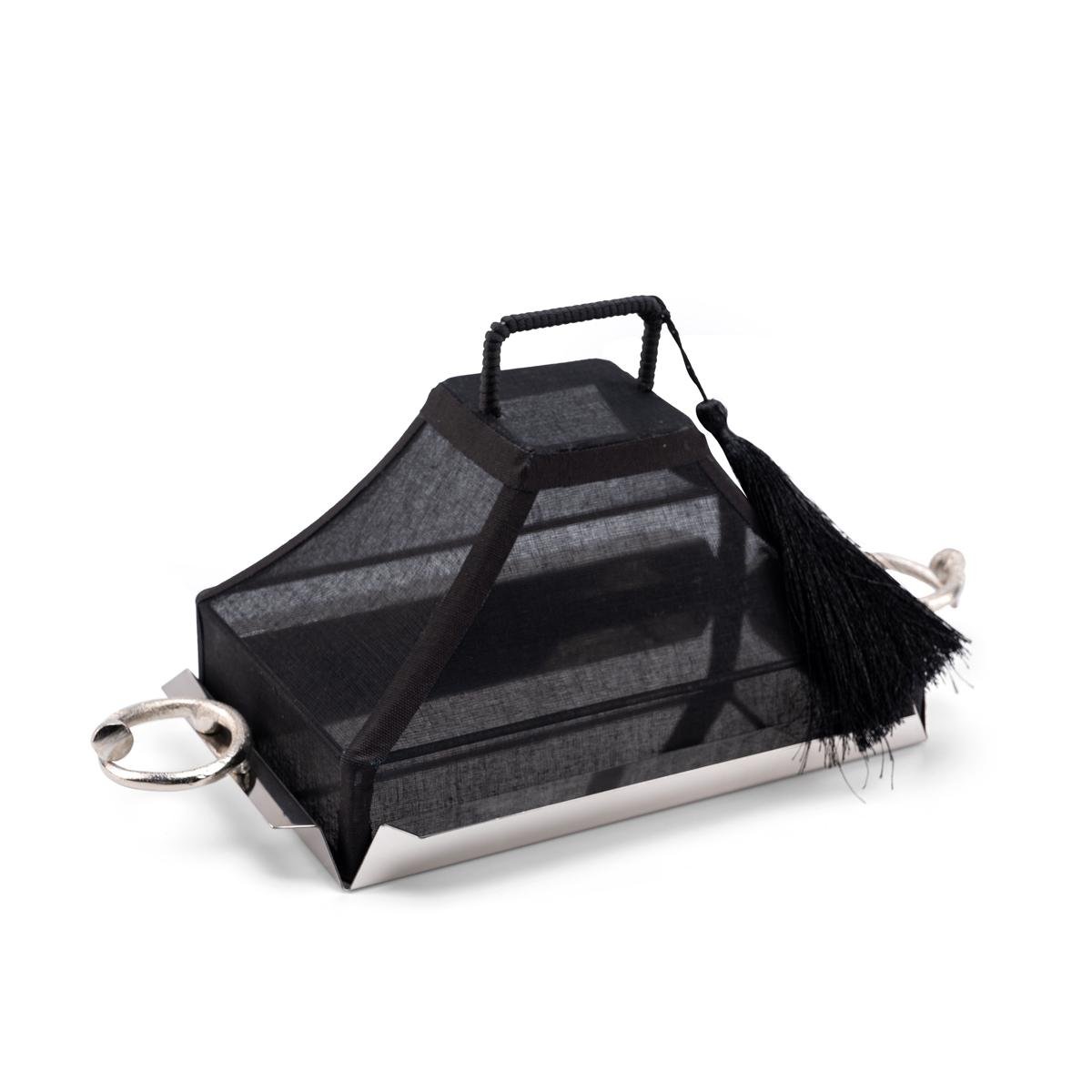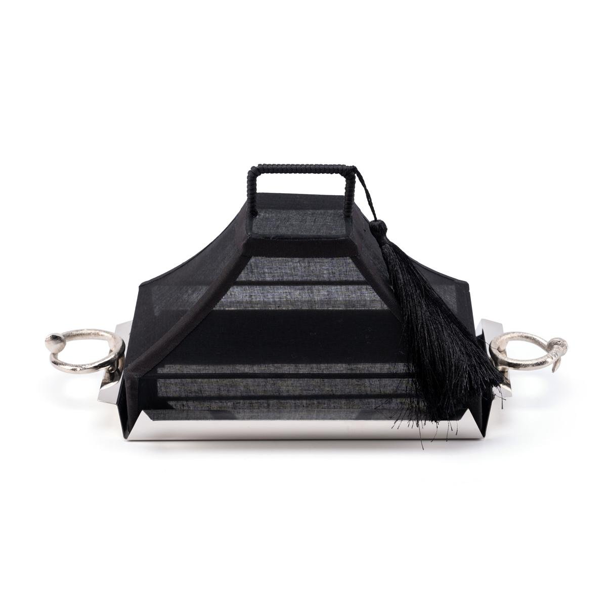 تتميز بمقبض مسمار أنيق على طراز كارتييه. مصنوعة بدقة، هذه الصينية مثالية لتقديم الحلويات والمأكولات الشهية الأخرى بأسلوب راقٍ. تأتي الصينية مع غطاء قماش قطني أنيق، لضمان بقاء الحلويات طازجة ومحفوظة.