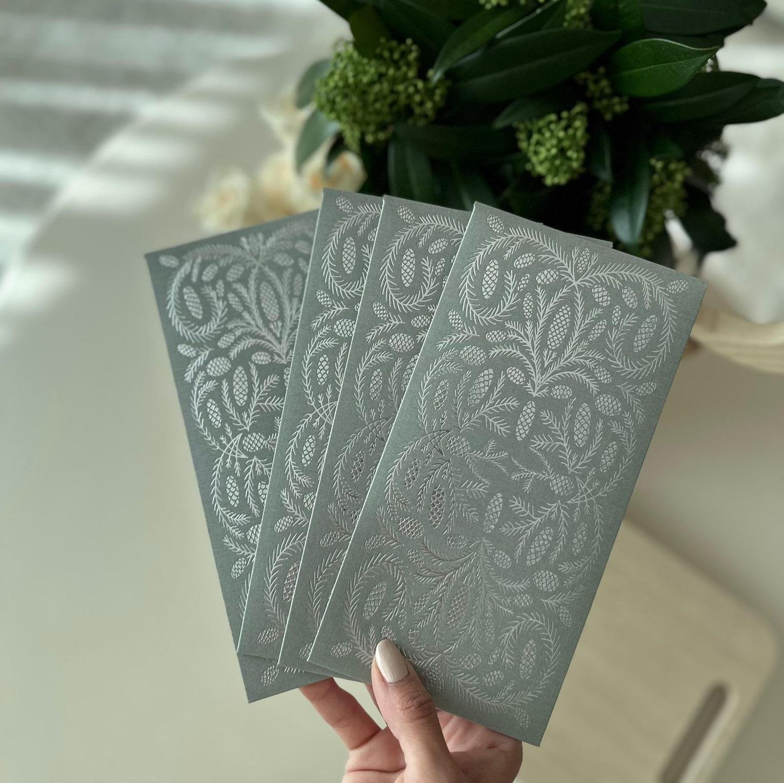 يتميز هذا الظرف الراقي بنقوش صنوبر بارزة محفورة بدقة على ورق فاخر محكم الملمس باللون الأخضر الغامق، مما يمنحه طابعًا طبيعيًا أنيقًا ولمسة من التميز.