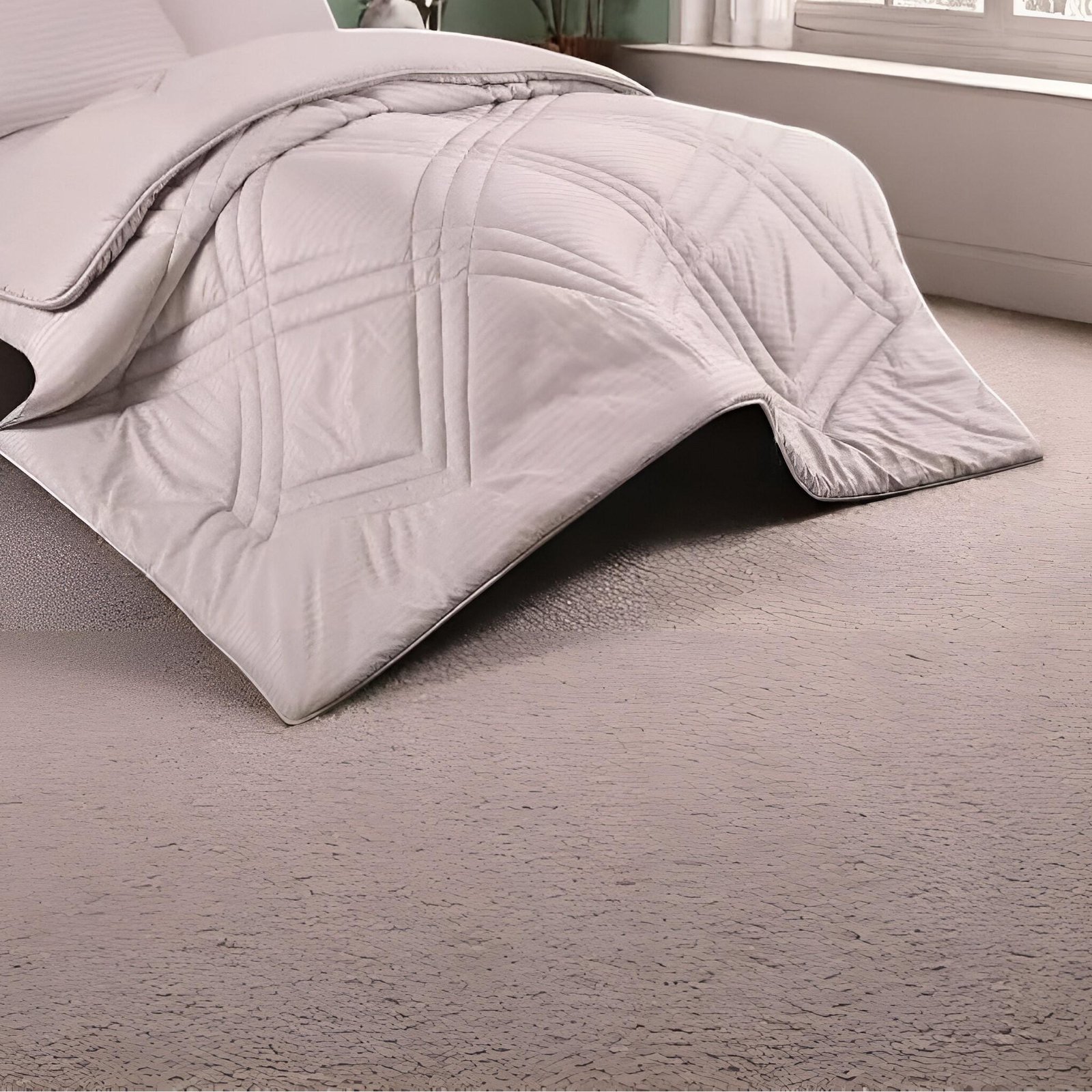 طقم مفارش من مورا إسبانيا مكون من 6 قطع من مجموعة ستار لاين. يتميز بتصميم شبكي مبطن غير لامع يضفي إحساساً بالهدوء والتنظيم على الغرفة، مع لمسة ناعمة وجودة إسبانية فائقة تجمع بين البساطة والأناقة والراحة.