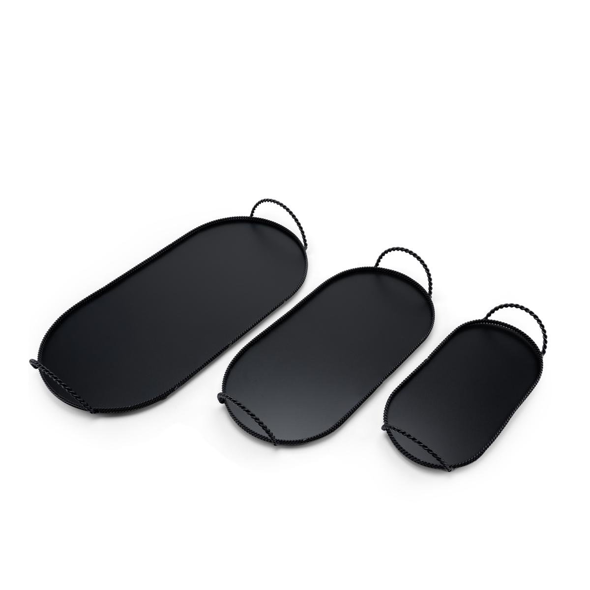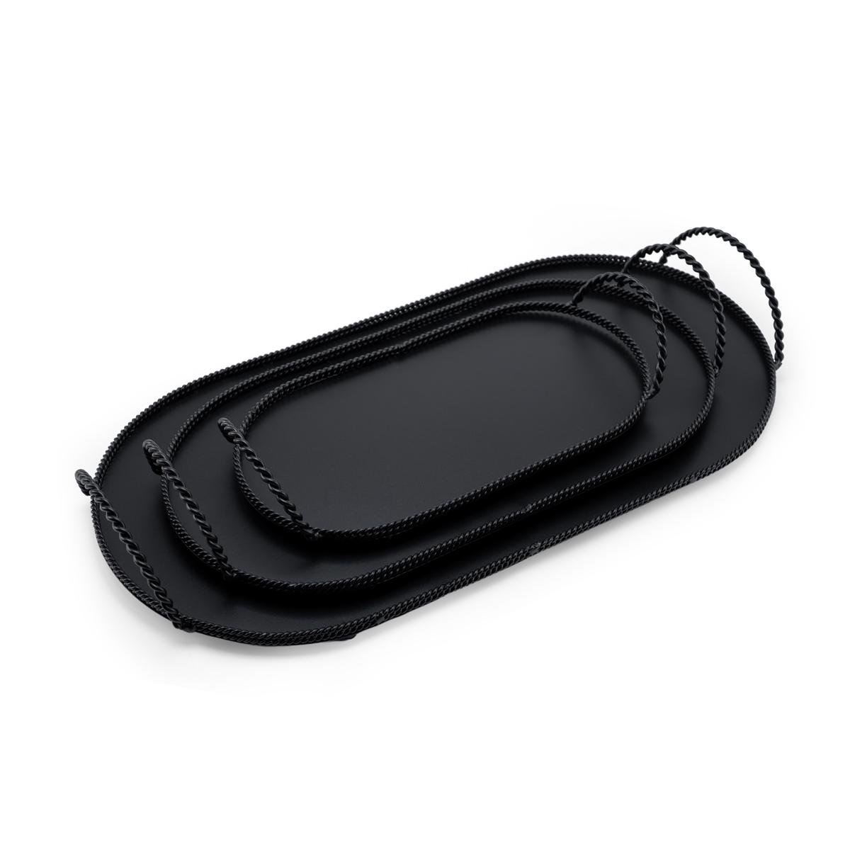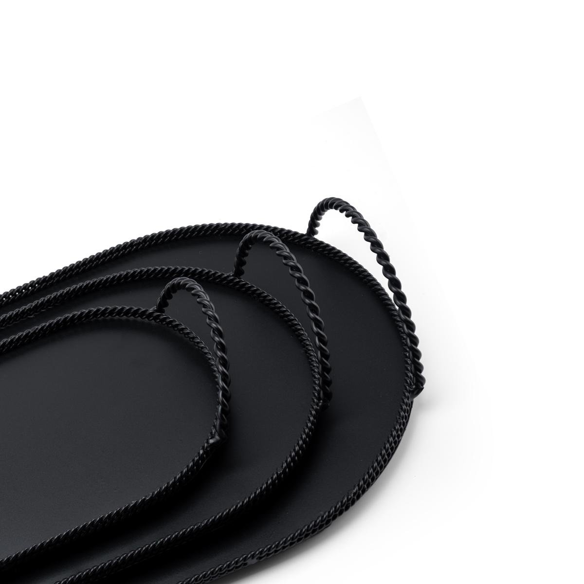 صواني التقديم المعدنية البيضاوية بمقابض الحبل الملفوفة. تم تصميم هذه الصواني بشكل جميل لتجمع بين سحر الطراز الريفي والاناقه ، مما يجعلها الإضافة المثالية لمطبخك، طاولة الطعام، أو طاولة القهوة. سواء كنت تقدم المقبلات، الإفطار في السرير، أو تعرض العناصر الزخرفية، هذه الصواني عملية بقدر ما هي أنيقة.
