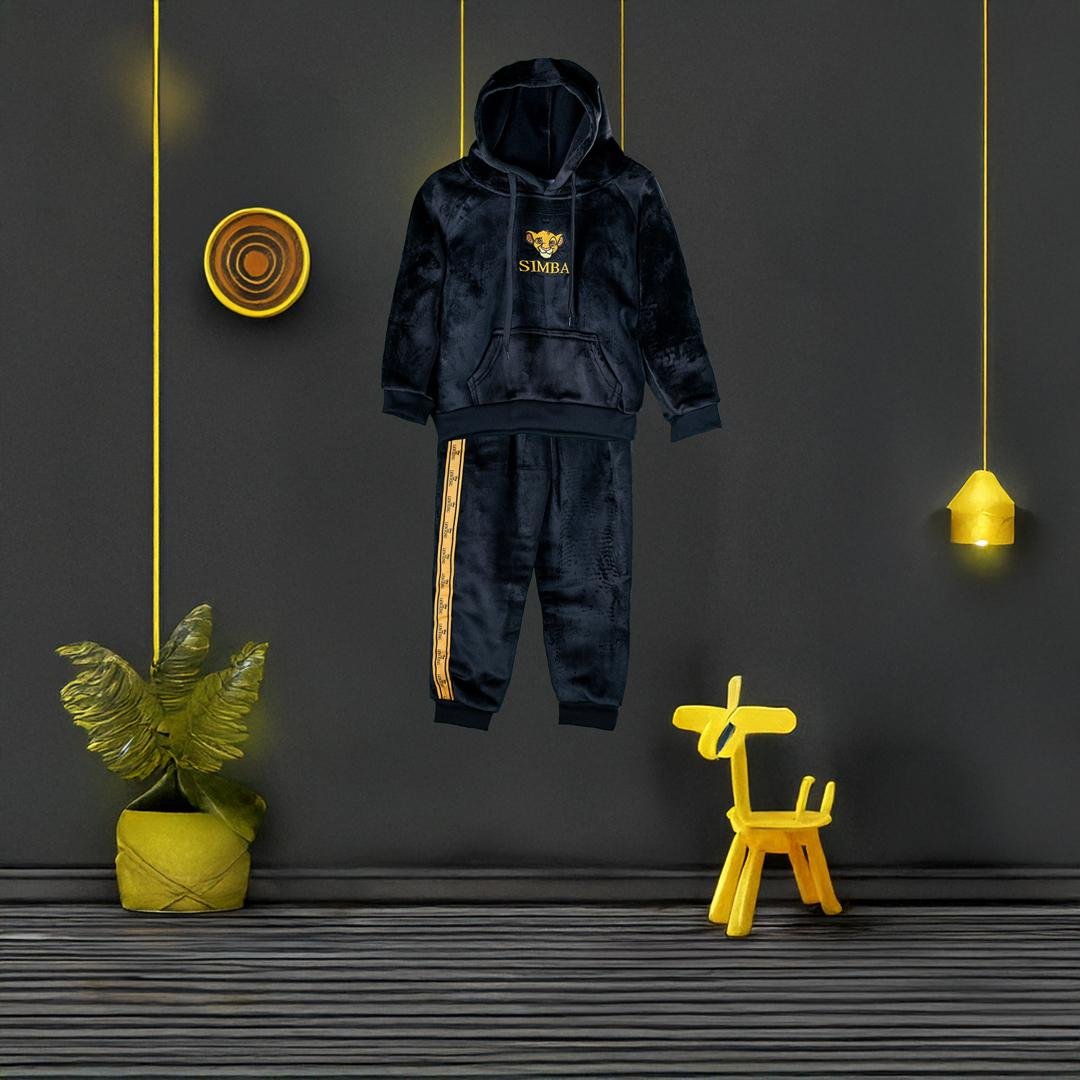تأتي هذه البدلة الرياضية باللون الأسود مع تفاصيل ذهبية بشكل مميز ونسيج مخملي ناعم مما يشعر طفلك بالراحة، مناسبة للمنزل والخروج للنادي والتجمعات العائلية. بالإضافة لغطاء رأس مزين بشعار سيمبا الأنيق وكلمة "SIMBA" باللون الذهبي، مما يضيف لمسة من الفخامة. تأتي السراويل المطابقة بخطوط ذهبية أنيقة على الجانبين، مما يضمن بروز طفلك في أي مكان.