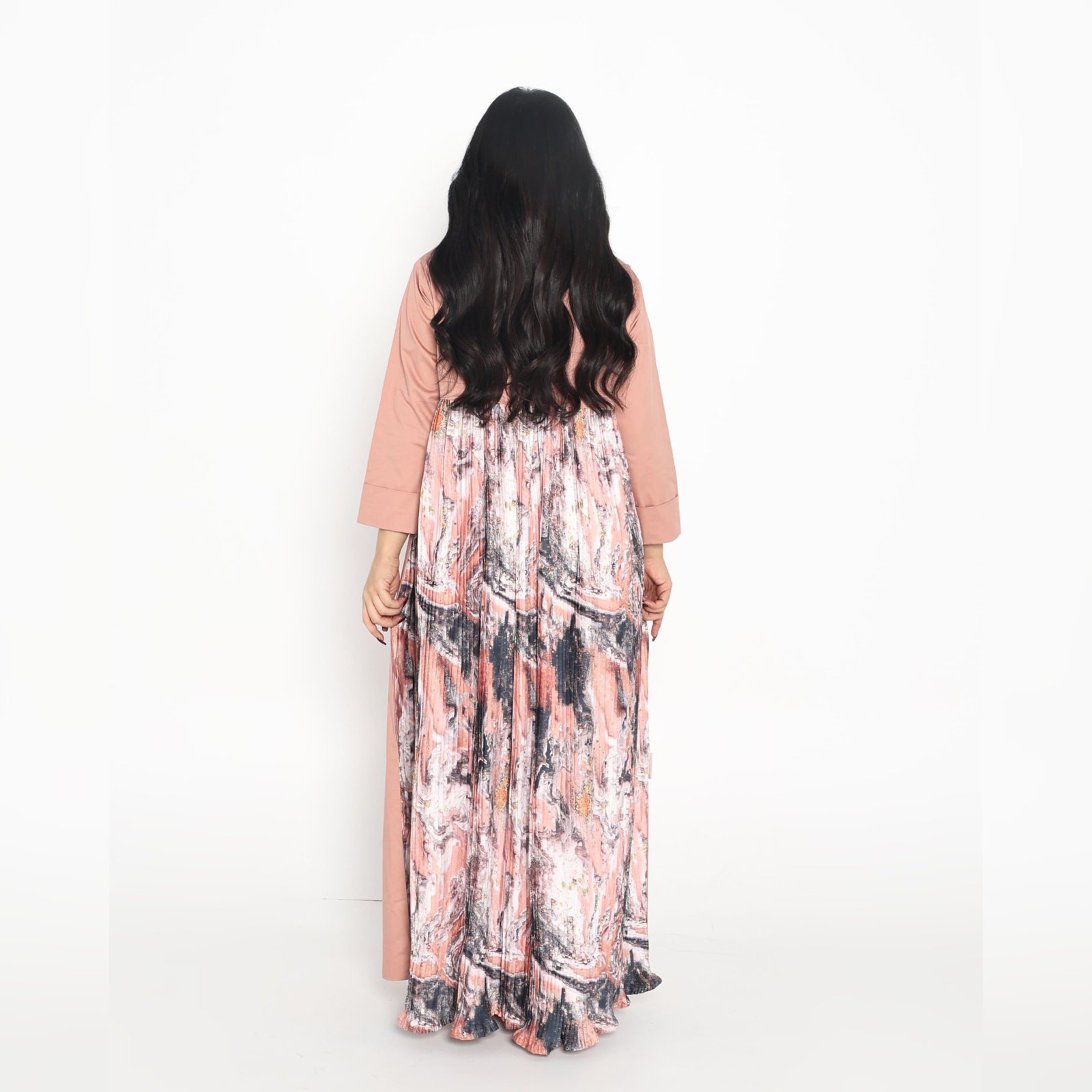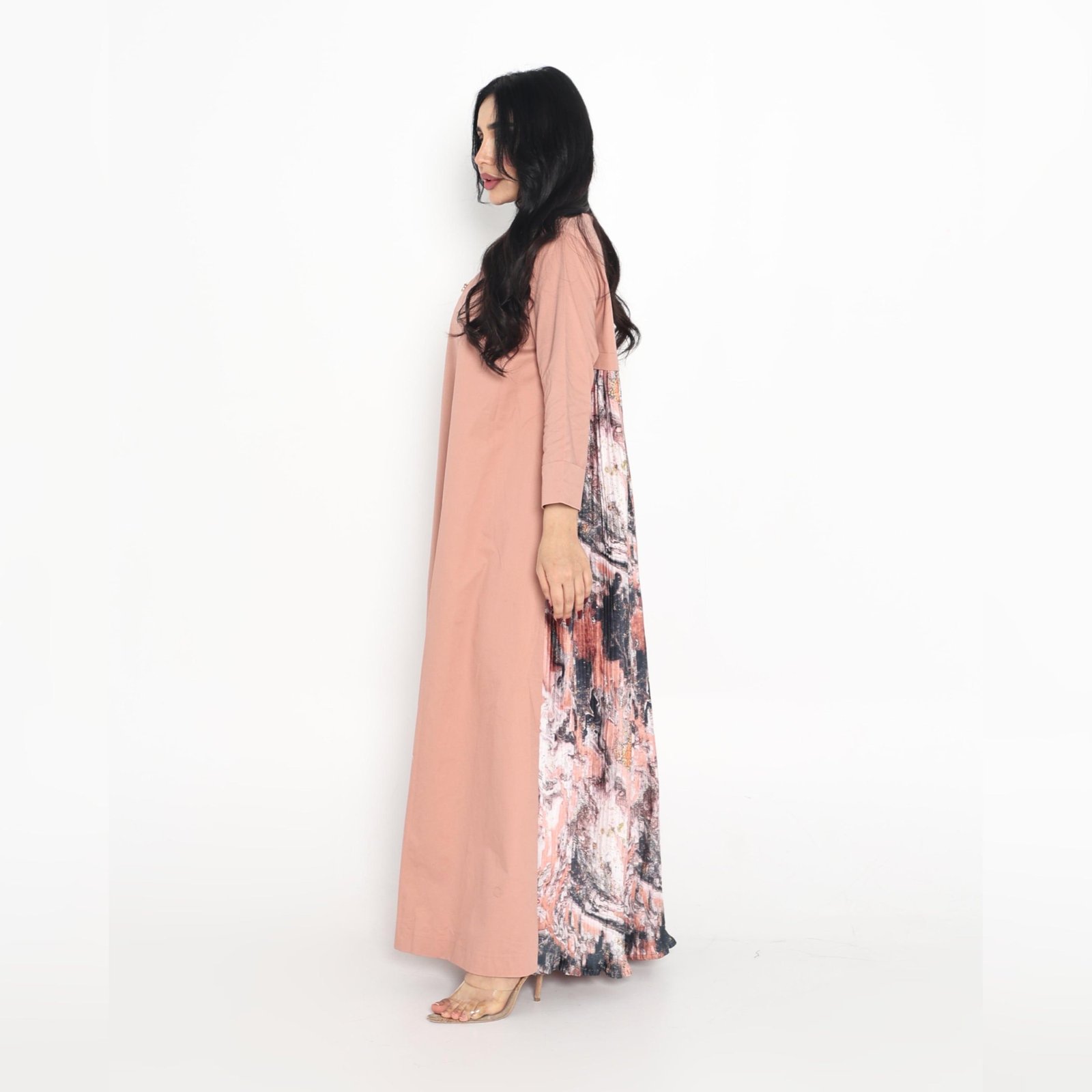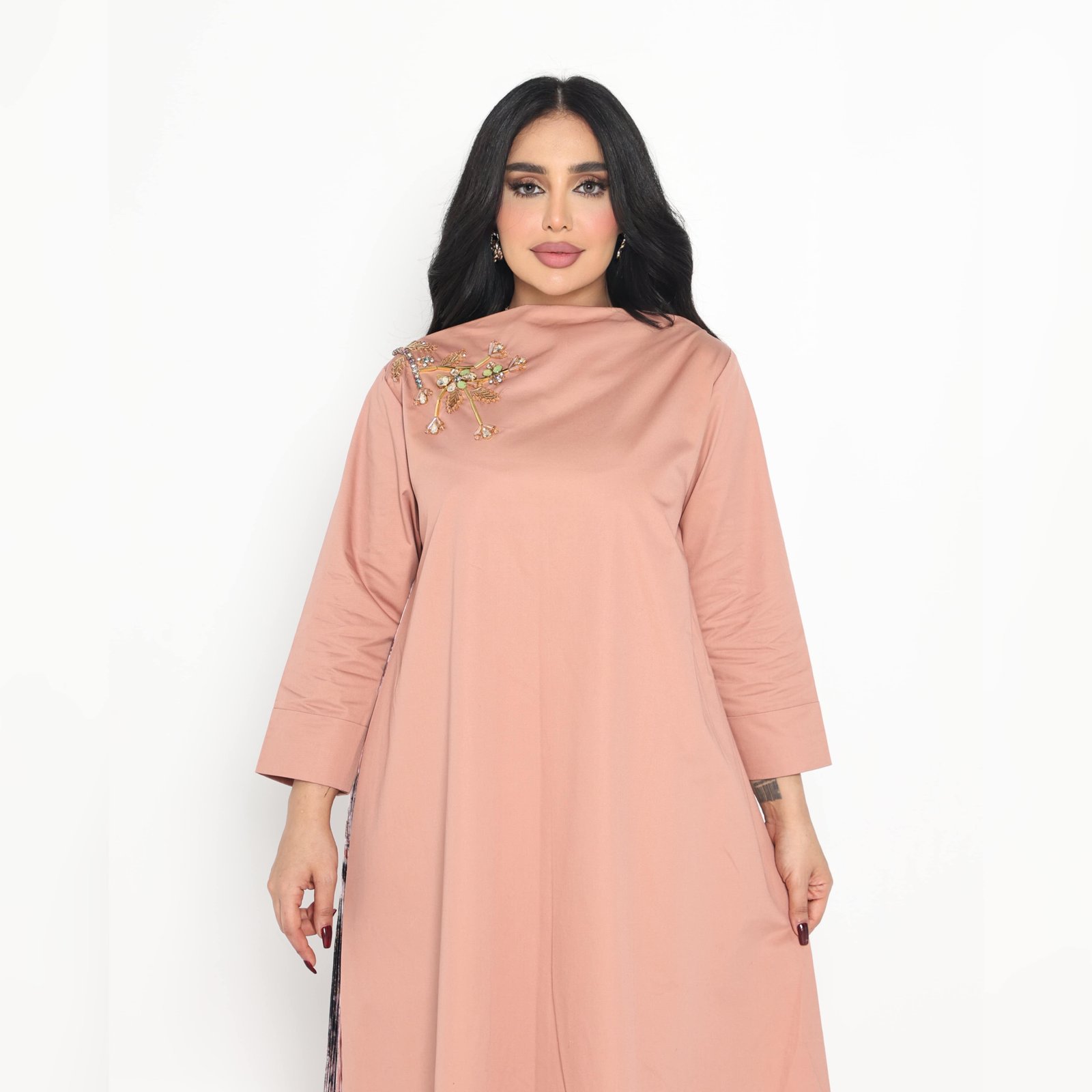 تميزي بإطلالة ساحرة وأنيقة لا تنسى مع هذا الفستان الفريد من نوعه مع دراعة استقبال مع شك جينز ماكس مارا من الأمام وحرير ملون من الخلف