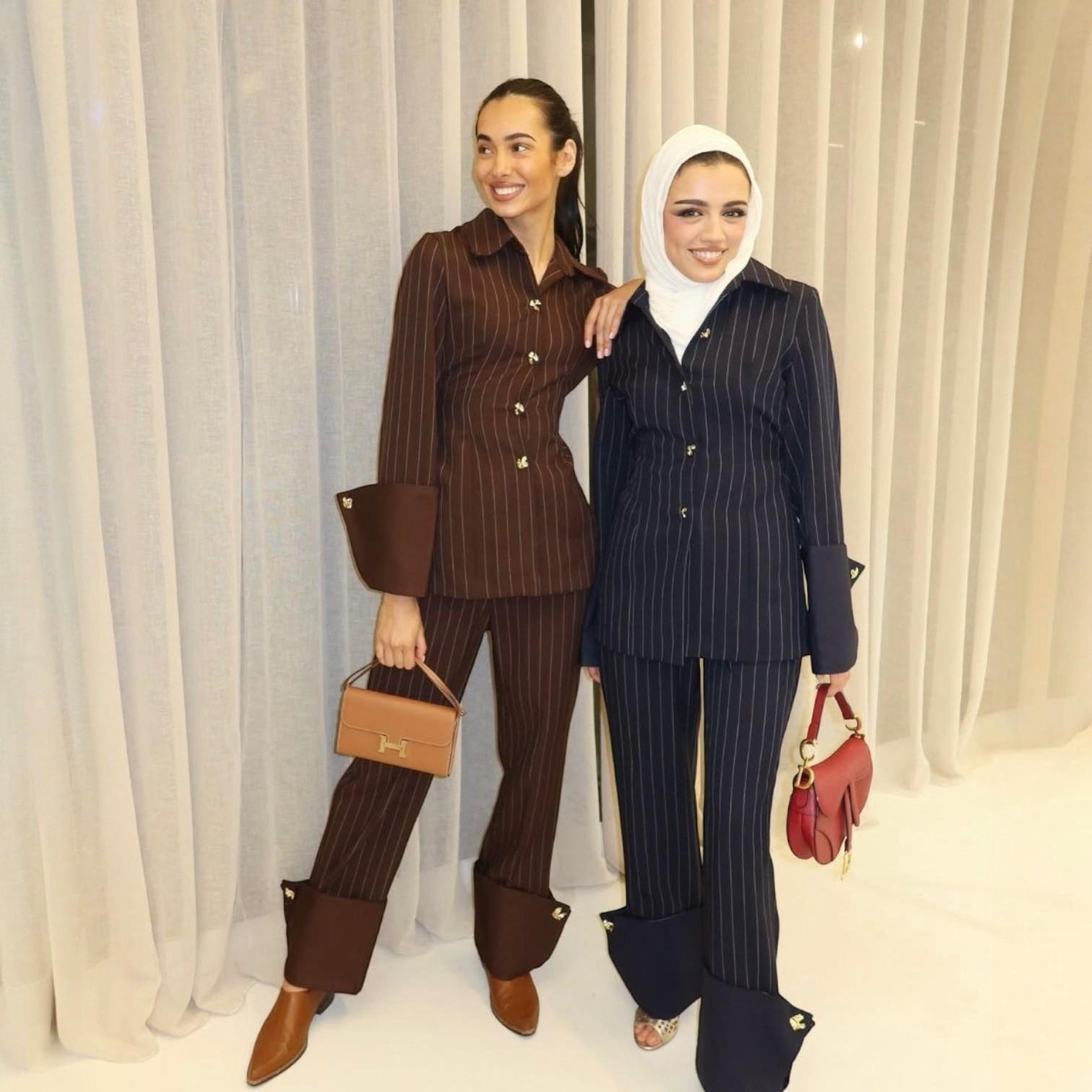 طقم بدلة بلون أسود أنيق وعملي مع خطوط بيضاء، هذا الطقم مكون من جاكيت وبنطال بتفاصيل راقية. يتميز الجاكيت بقصة مصقولة وأكمام مزينة بخطوط دقيقة تضيف لمسة ناعمة من الفخامة. ويكتمل الإطلالة ببنطال بقصة مستقيمة وخصر مرتفع يمنحك مظهرًا أنثويًا وأنيقًا. مثالي لإطلالات العمل، المناسبات الرسمية، أو السهرات المسائية.