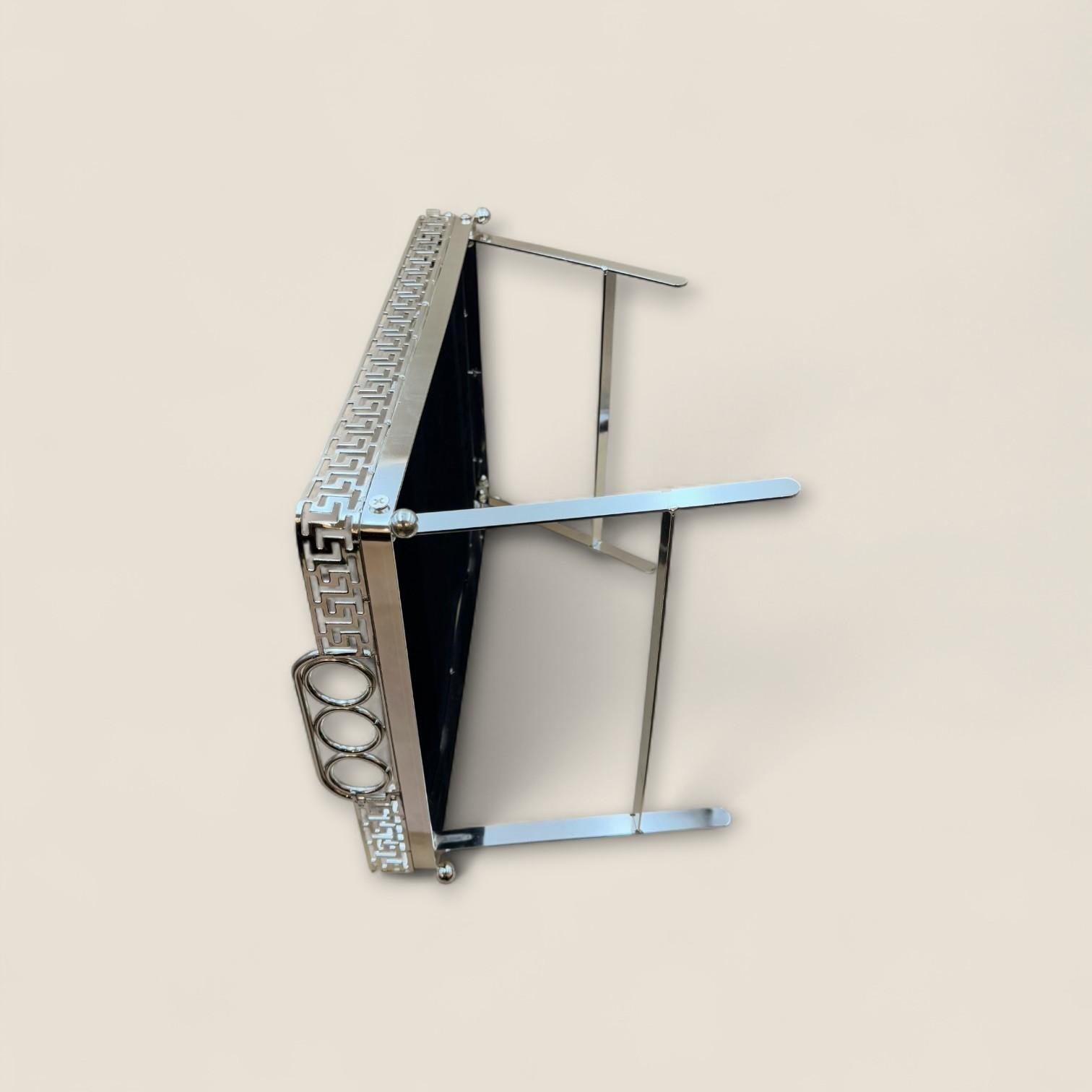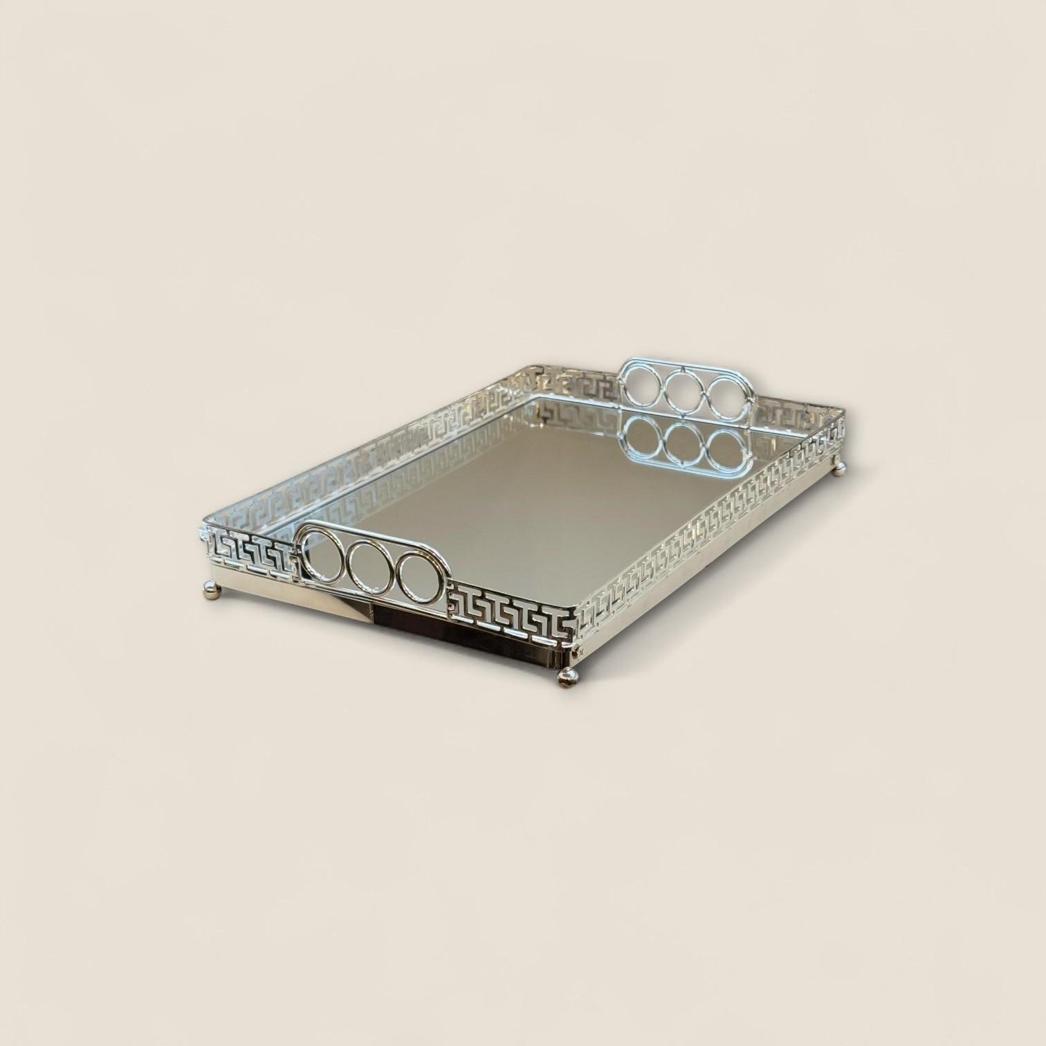 تأتي هذه الصينية بقاعدة مرايا لامعة تعكس الضوء وتعزز أناقة المكان، مع إطار معدني فضي مصمم بشكل هندسي جذاب يلفت الأنظار.