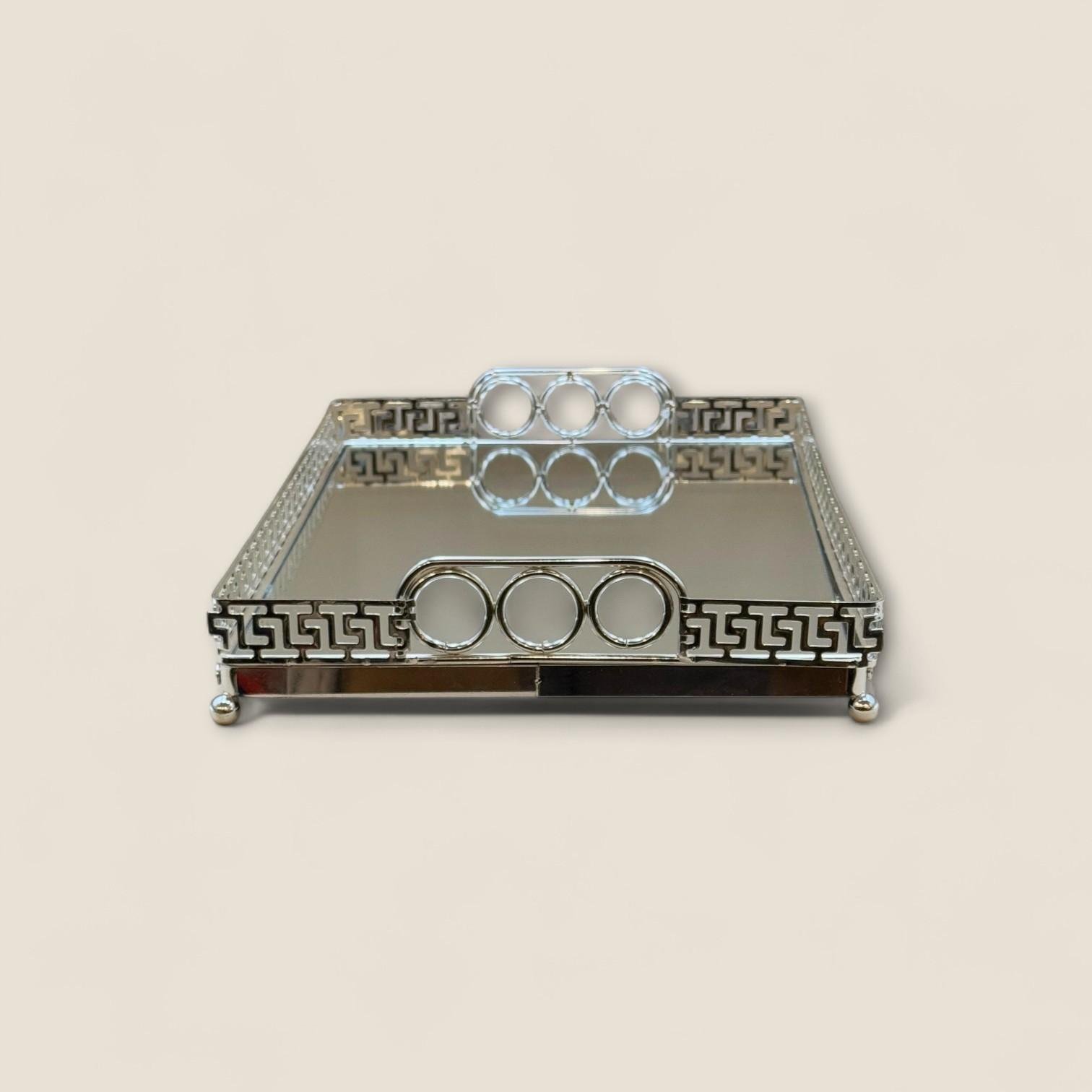 تأتي هذه الصينية بقاعدة مرايا لامعة تعكس الضوء وتعزز أناقة المكان، مع إطار معدني فضي مصمم بشكل هندسي جذاب يلفت الأنظار. مثالية لتقديم المشروبات أو الحلويات، أو لتزيين الطاولات بعرض العطور، الشموع أو الاكسسوارات بأسلوب راقٍ ومنظم.