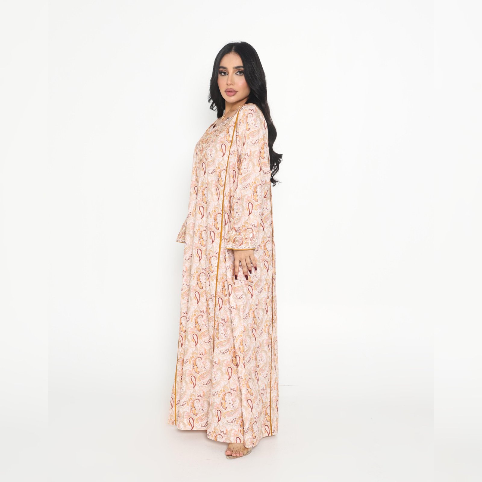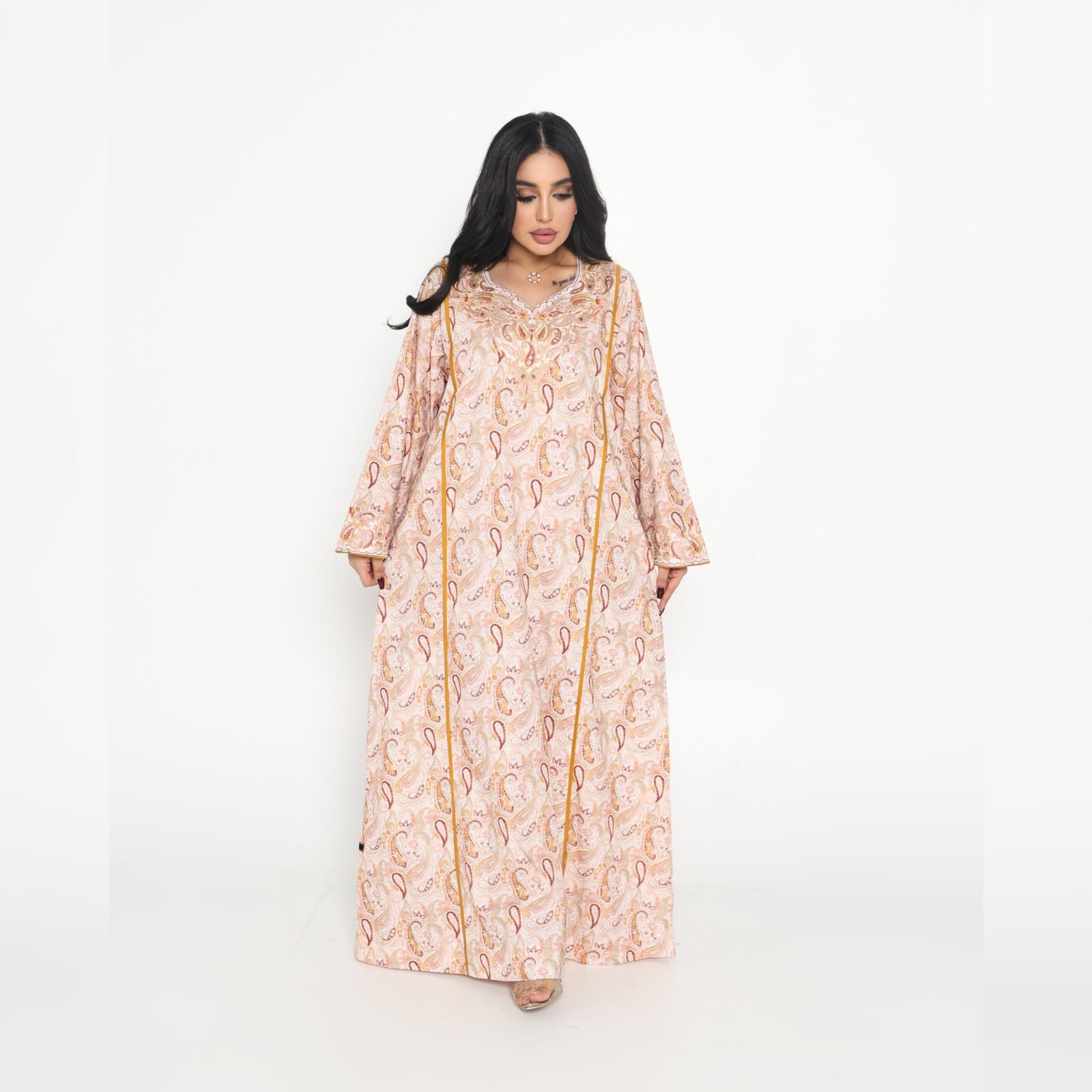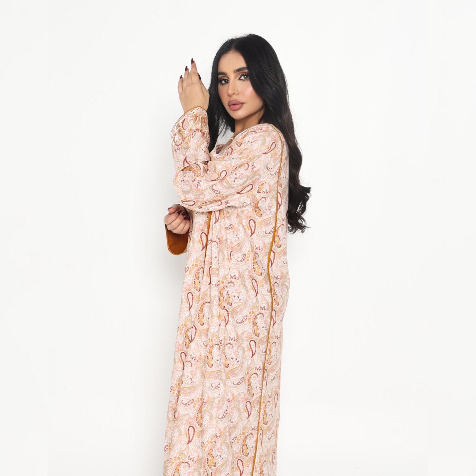 تألّقي براحة وأناقة مع قفطان بلون وردي فاتح بطبعة بيزلي بلون الخردل الذهبي. تصميم مريح بانسيابية رائعة ونقشة أنثوية جذّابة، يُزيّنه تطريز ناعم عند الأكمام لإضفاء لمسة فاخرة بسيطة مثالي للاسترخاء في المنزل أو لاستقبال الضيوف بإطلالة راقية