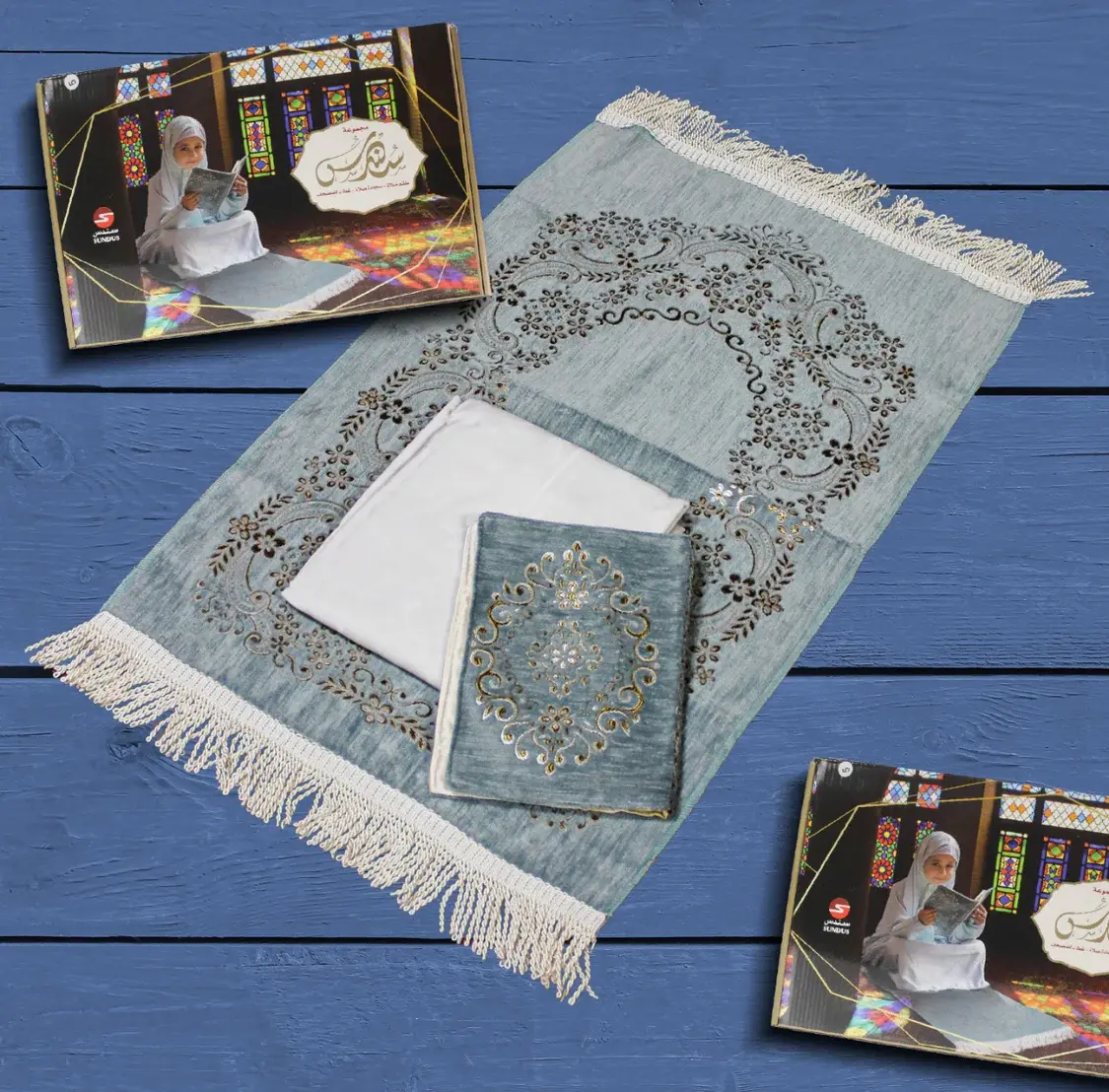 اجعلي وقت الصلاة أكثر تميزًا مع طقم الصلاة من سندس، الذي يتضمن سجادة صلاة ناعمة، ثوب صلاة مريح، وغطاء للمصحف، بتصميم أنثوي جذاب يشجع الفتيات الصغيرات على أداء الصلاة بحب وخشوع