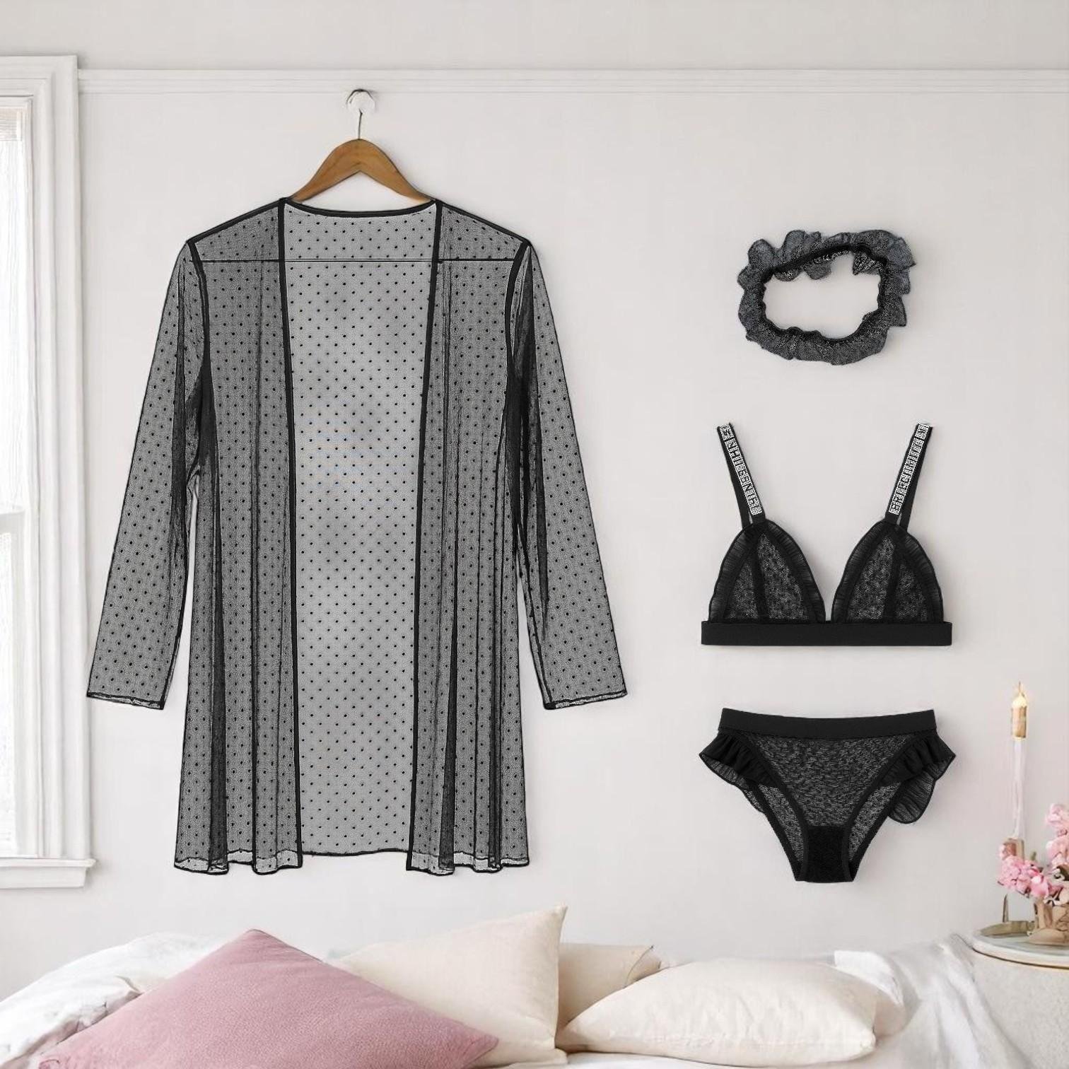 تمتعي بالجاذبية المطلقة مع طقم لانجري VIP Midnight Muse المكون من أربع قطع بتصميم شفاف فاخر. يجمع هذا الطقم بين الأناقة الكلاسيكية واللمسة العصرية، مصنوع من أقمشة ناعمة وخفيفة تمنحك إحساسًا رائعًا بالراحة والأنوثة. سواءً لمناسبة خاصة أو لتعزيز ثقتك بنفسك، هذا الطقم سيكون خيارك المثالي.