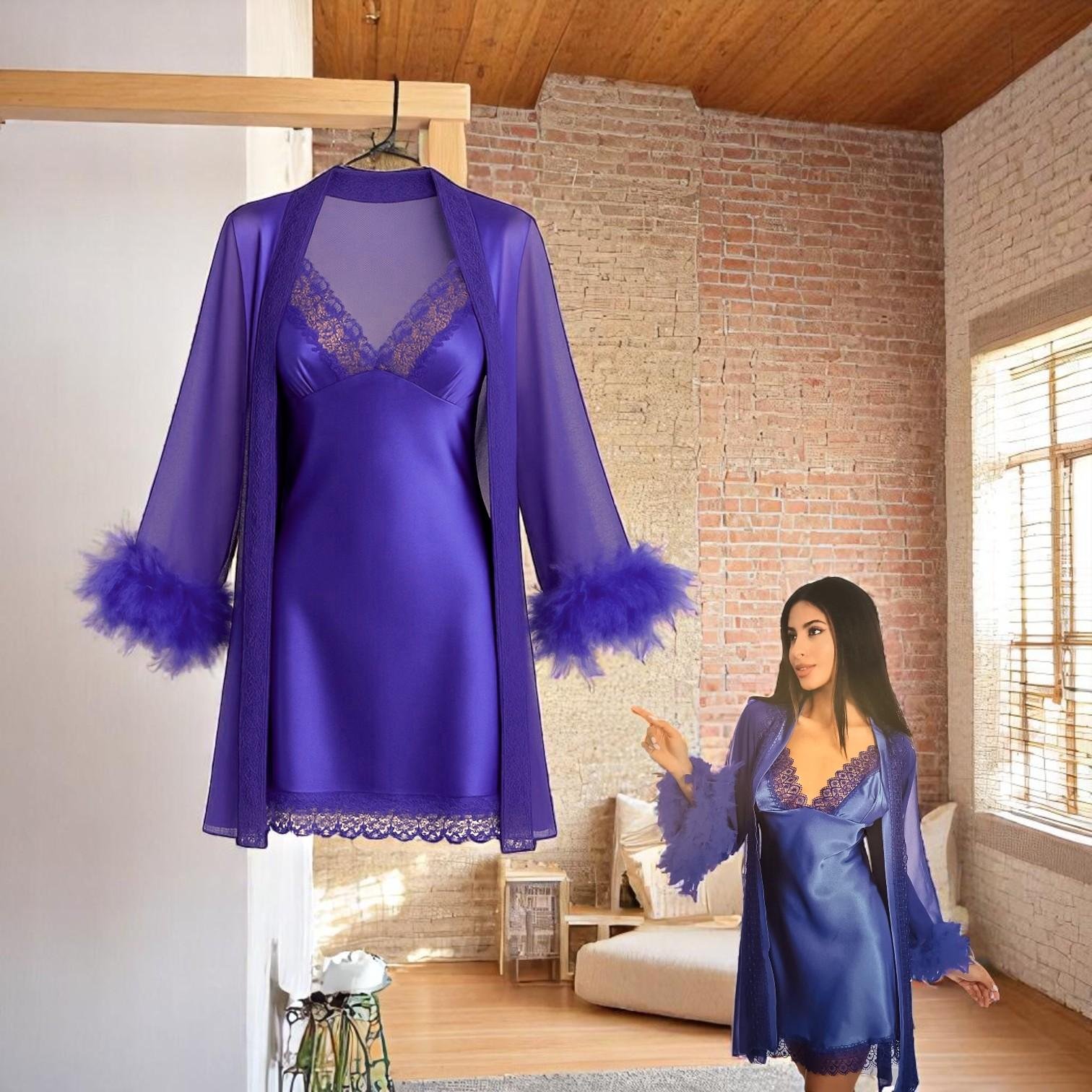 دللي نفسك بأناقة لا تضاهى مع طقم النوم الفاخر المكوّن من قميص ساتان ناعم وروب شفاف بخفّة الريشة. يتميز القميص بلمسة أنثوية من الدانتيل، بينما يضفي الروب الشفاف مع تفاصيل الأكمام المصنوعة من الريش لمسة ساحرة تجعله مثاليا لأي ليلة مميزة.
