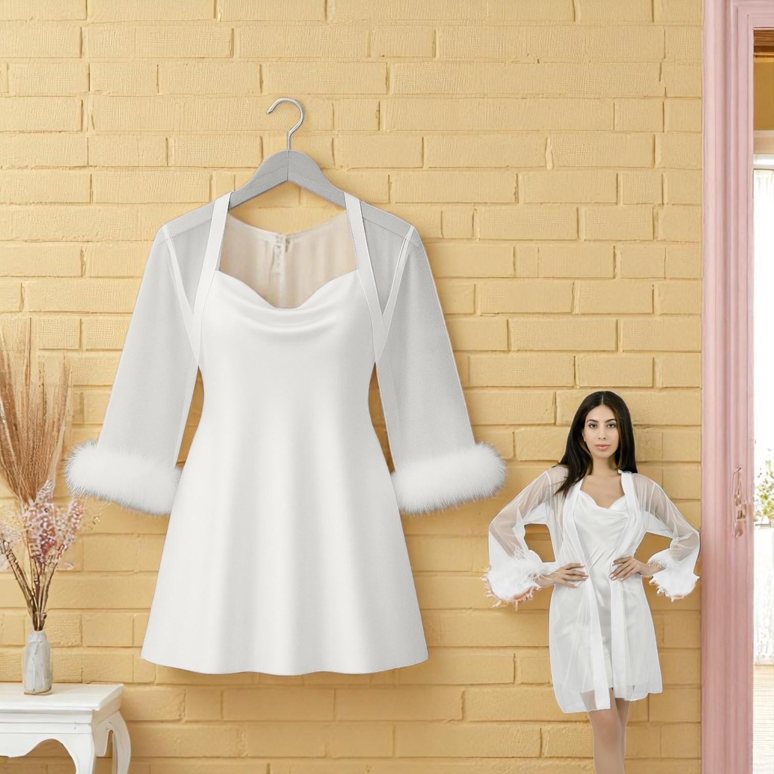 استمتعي بالفخامة مع مجموعة روب الشيف الشفاف وفساتين الساتان المصممة لأناقة مريحة وسهلة. يتميز روب الشبكة الحريرية بتدفق جميل فوق فستان الساتان الناعم، بينما تضيف أكمام الفراء الصناعي لمسة من البذخ. مثالية لجلسات التصوير، ملابس العروس، أو ببساطة للاسترخاء بأناقة. خفيفة الوزن، تسمح بمرور الهواء، وتضفي إطلالة جذابة – هذه المجموعة ضرورية لكل من يحب الراحة مع لمسة من الجمال.
