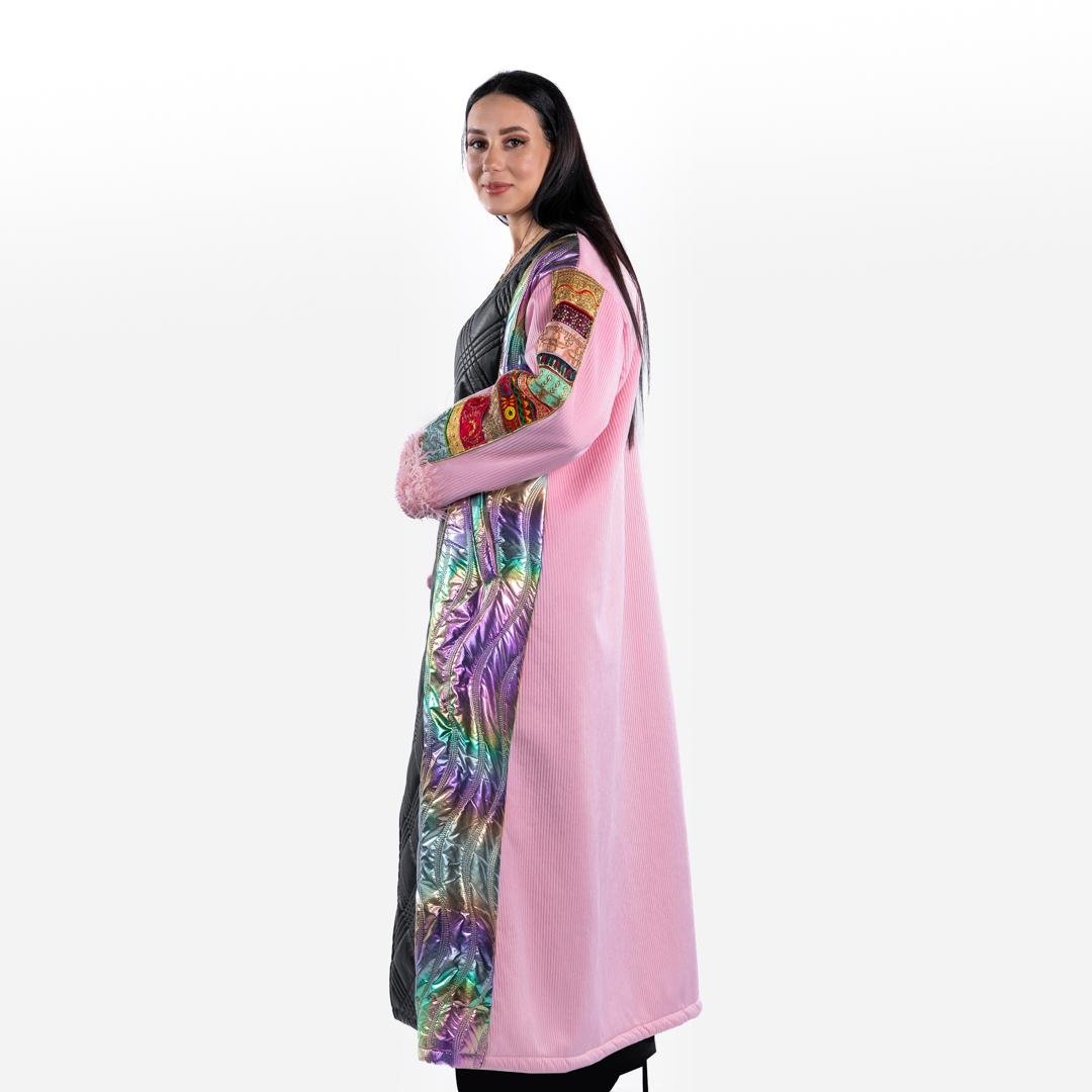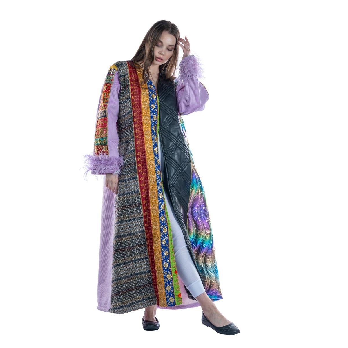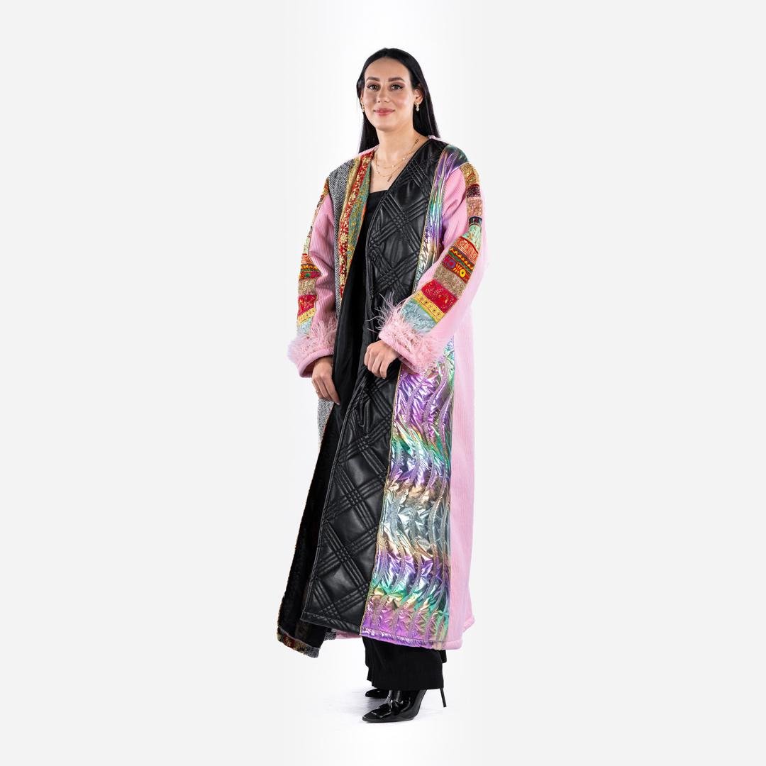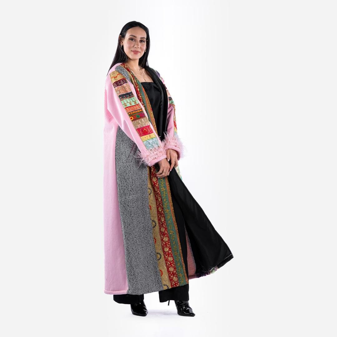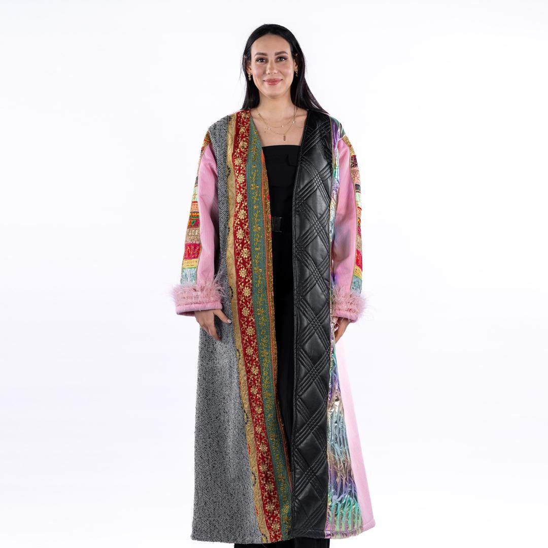 ادخلي عالم الأناقة الزاهية مع البشت الملونة بنقوش. يتميز هذا المعطف الطويل بمزيج متناغم من الألوان والأنسجة، مما يجعله قطعة بارزة في أي خزانة ملابس. تم تصميم هذا المعطف بعناية فائقة، حيث يجمع بين العناصر التقليدية والمعاصرة، مما يوفر مظهراً فريداً وأنيقاً.