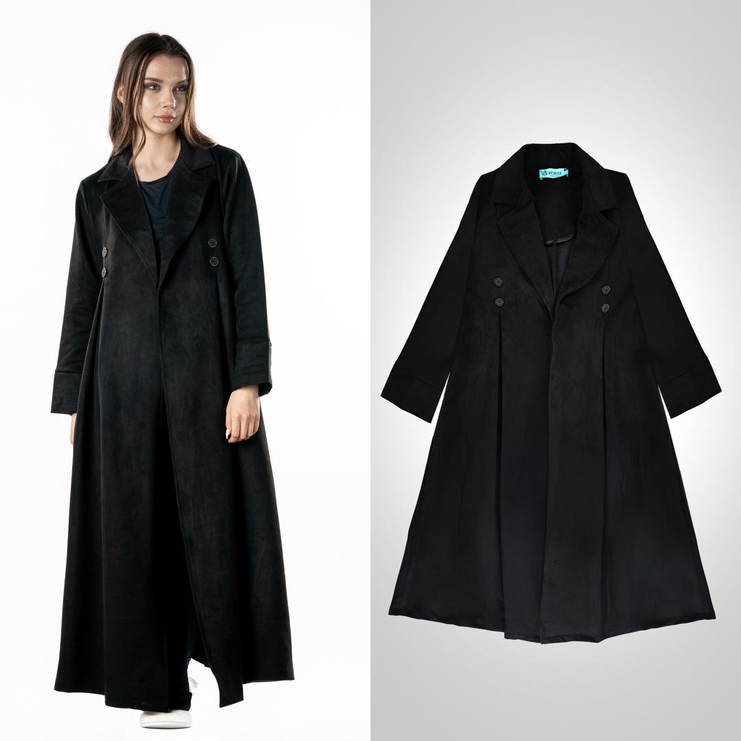 "دلّي نفسكِ هذا الشتاء بمعطف السويد الطويل الأنيق، الذي يجمع بين الدفء والأناقة لتكوني الأكثر تألُّقًا في الأجواء الباردة!"